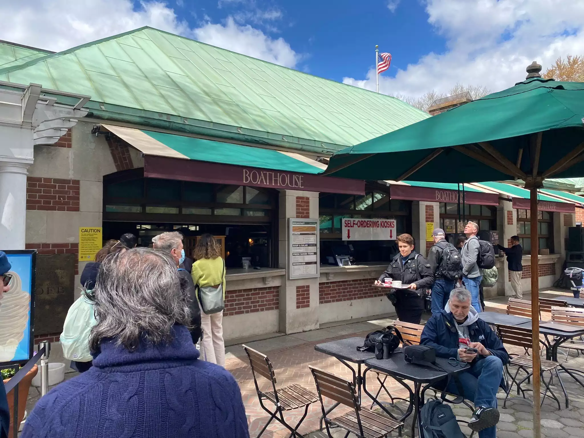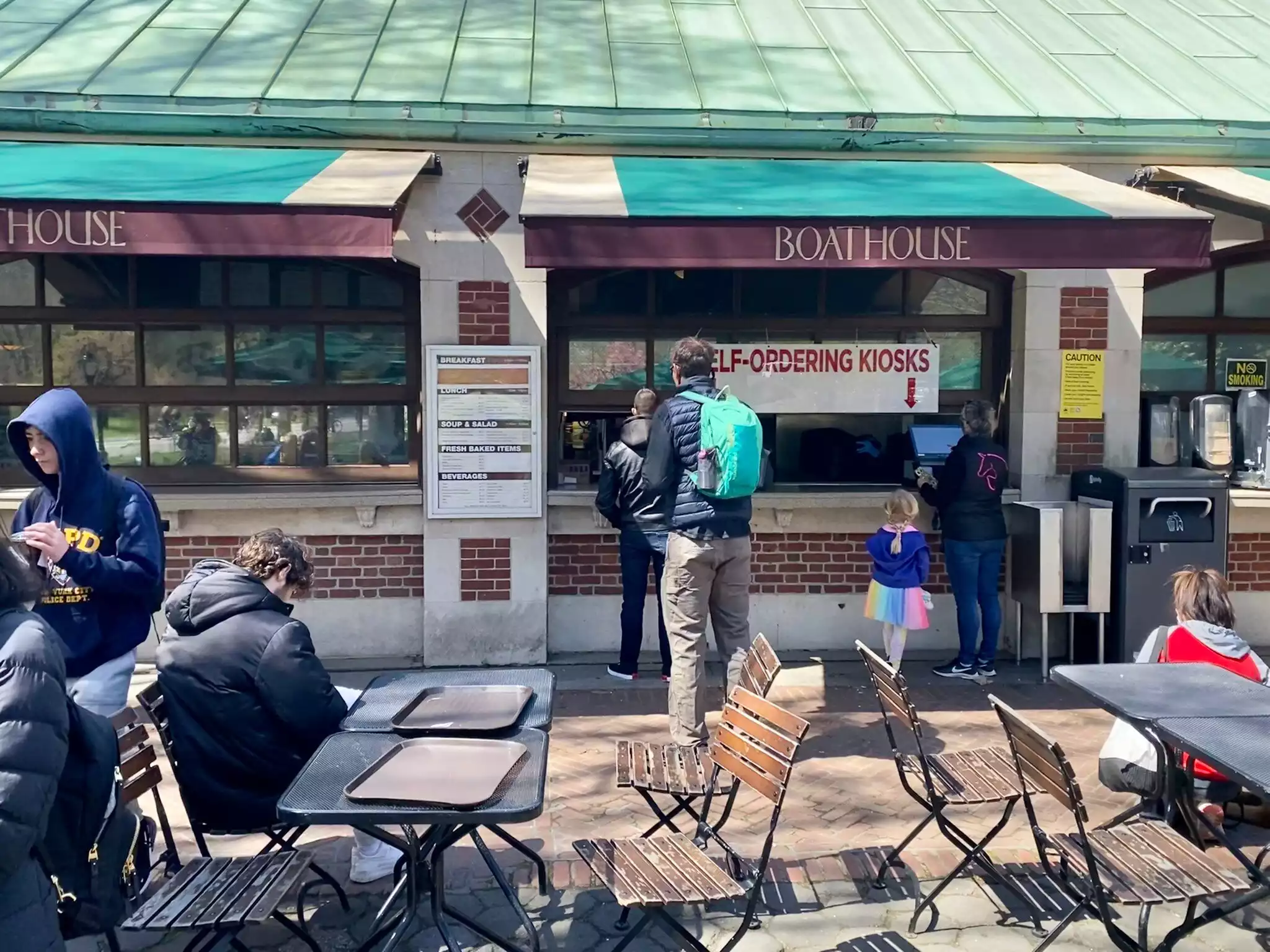 We ate at the cafe at Central Park Boathouse on a Sunday afternoon. There was a short line and then you order at the counter which is also where you get your food when it is ready. We would have preferred the interior of the restaurant overlooking the water but the menu is very different and much more expensive. Even at the cafe our meal for 4 was around $100 but our kids liked the selection better. It was a beautiful day and we enjoyed our time eating in the park.