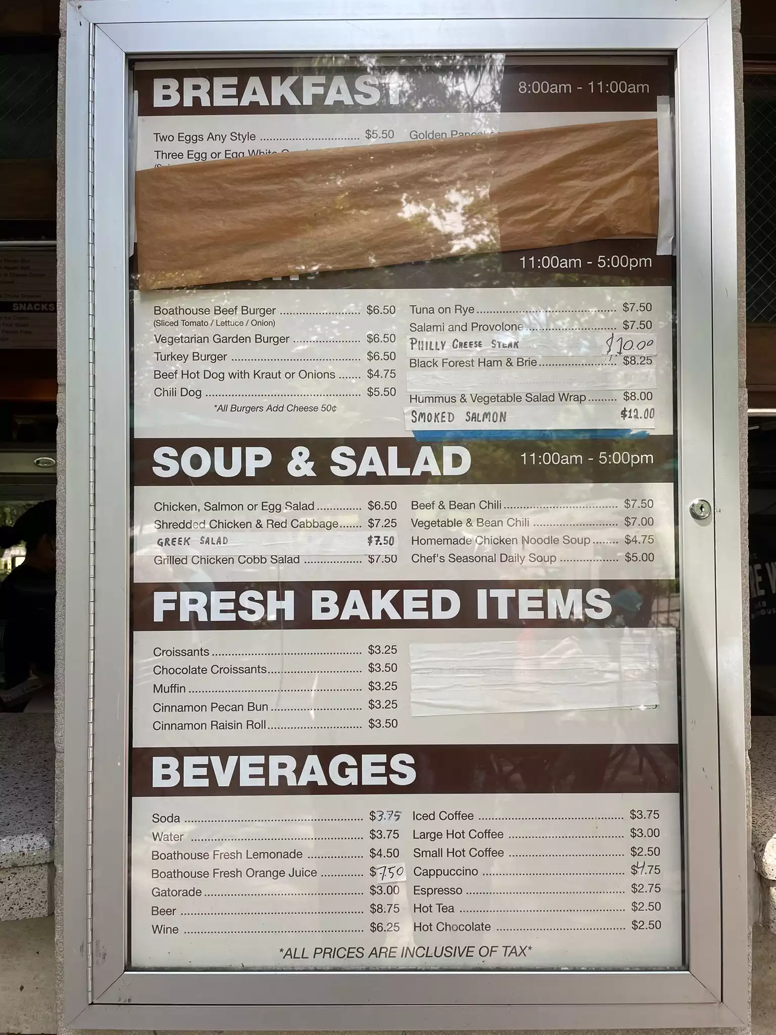 In full disclosure, we did not eat a meal at the Boathouse but had coffee and sat outside. It took a while to get our two chais, but the weather was nice and we enjoyed sipping them while people watching at the outdoor tables. Taking a look at the food menu in the main dining area, it looked like it was more expensive than what we would have paid for lunch so we skipped it. You can also use the public restrooms and walk around the grounds.