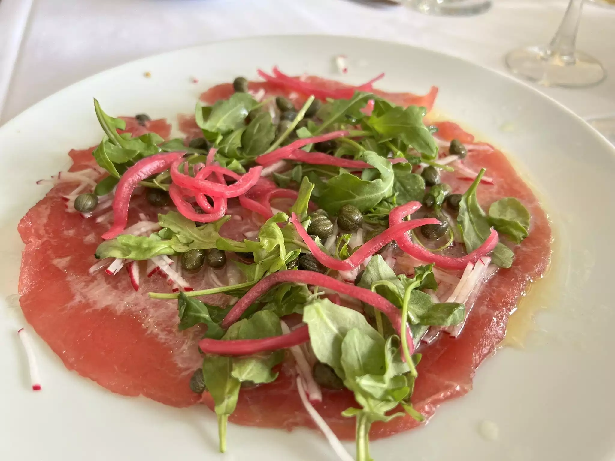 This is a lovely restaurant with very good, if pricey food. Excellent service. We had swordfish and trout both of which were very good. Excellent starters including a generous crab cocktail and superb mozerella salad.