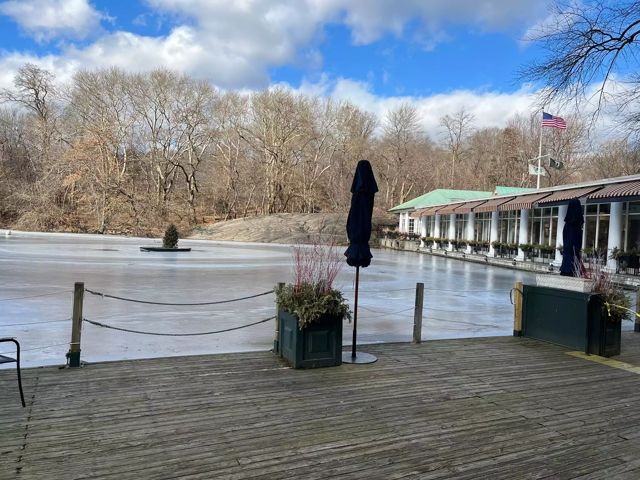 Lunch with friends a 20 minute walk through the park from the bottom of Central Park. Lovely setting, must be beautiful in the spring, summer and autumn. Friendly staff, super food. Only slight problem, bad smell emanating from the lake possibly, just spoilt it a little, but other than that, well worth a visit.