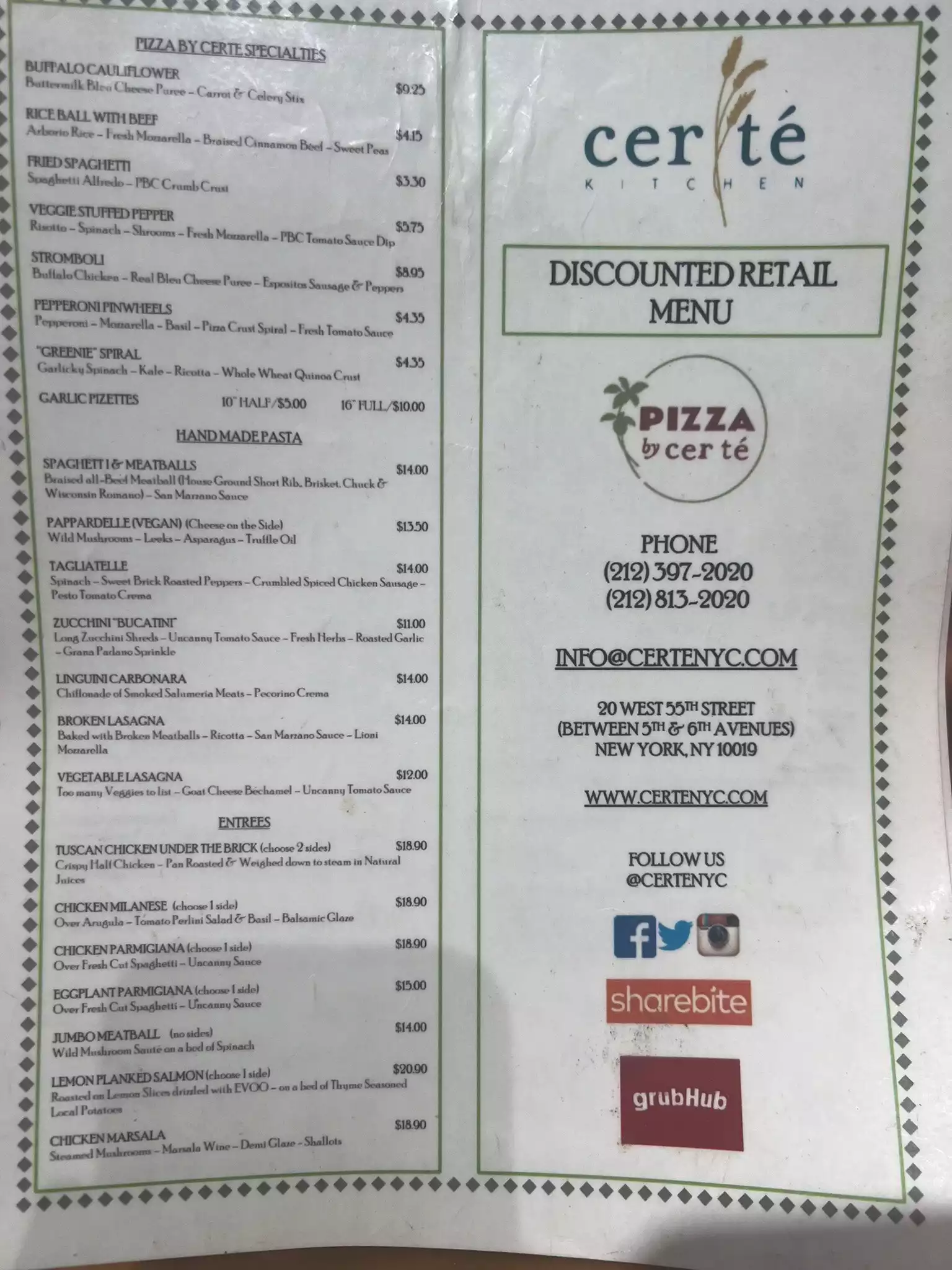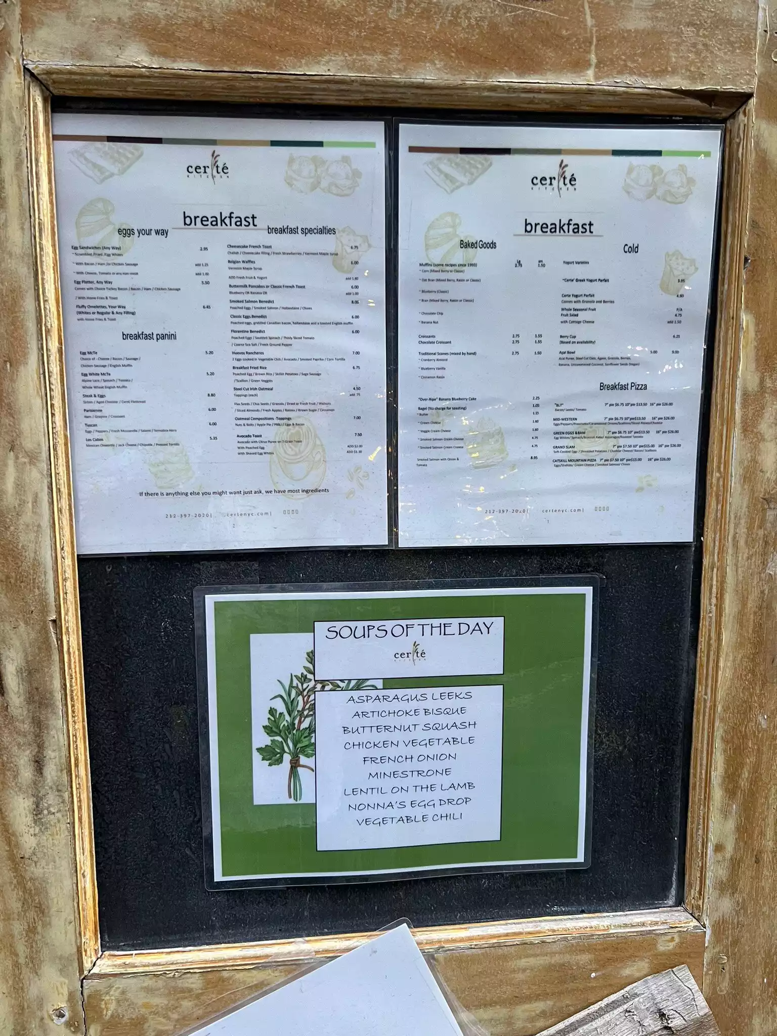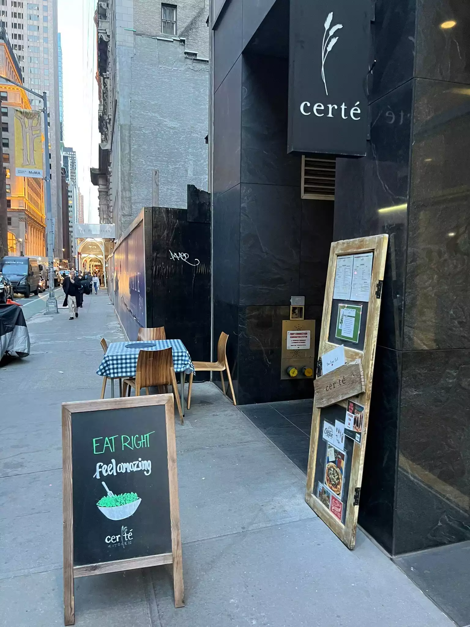 I visited Certe on 55th St in Manhattan around 5pm. I called & was told they close @ 6pm. I was shocked that the storefront was kinda dark & empty. There were no tables to sit out. The very nice counter man said, we are primarily a breakfast/lunch take out business. We do a lot of catering too. Although they were closing, he offered most hot n cold sandwiches/Soup/Salads/ Beverages. All the hot food & hot plate specials of the day were finished. I understood, but was disappointed about No place to sit. I ordered take out & ended up eating my dinner in the Sheraton Hotel Lobby. It was much too cold to eat outside. I had a great chicken breast & prosutto on a Roll, coleslaw & nice mushroom barley soup. Certe is reasonably priced for Manhattan & a very cordial counterman. He felt badly, & gave me a free snack container of Sweet n Spicy Almonds. Very nice gesture. A very good place for Take Out & Catering if you need reasonably priced-good food. I definately Will go back in the Spring & eat in the Park or Avenue Six & a Half, Outdoor Street Mall.