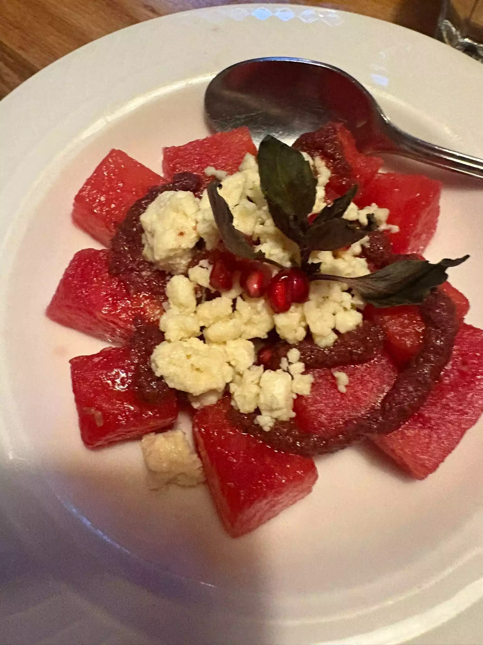 Wandered into this unfamiliar restaurant and was delighted to find out it was Georgian, a menu with which we were totally unfamiliar. Delightful ! An interesting menu of appetizers, soups and many new ingredients and combinations- the grape leaves stuffed with lamb and rice were some of the best we’ve ever had. The watermelon with feta and an opal dressing and persimmon was yummy. Service was great as was the ambiance
