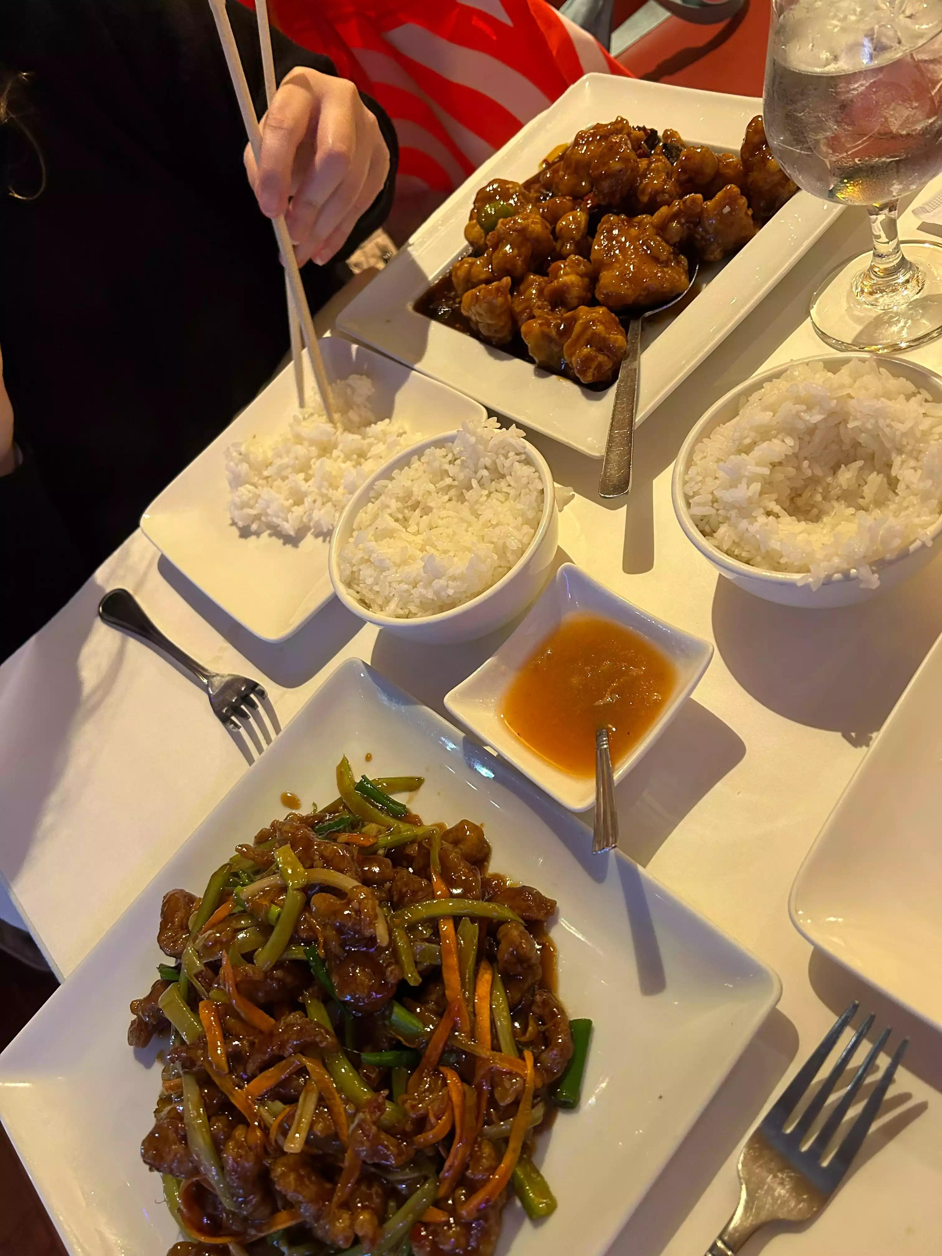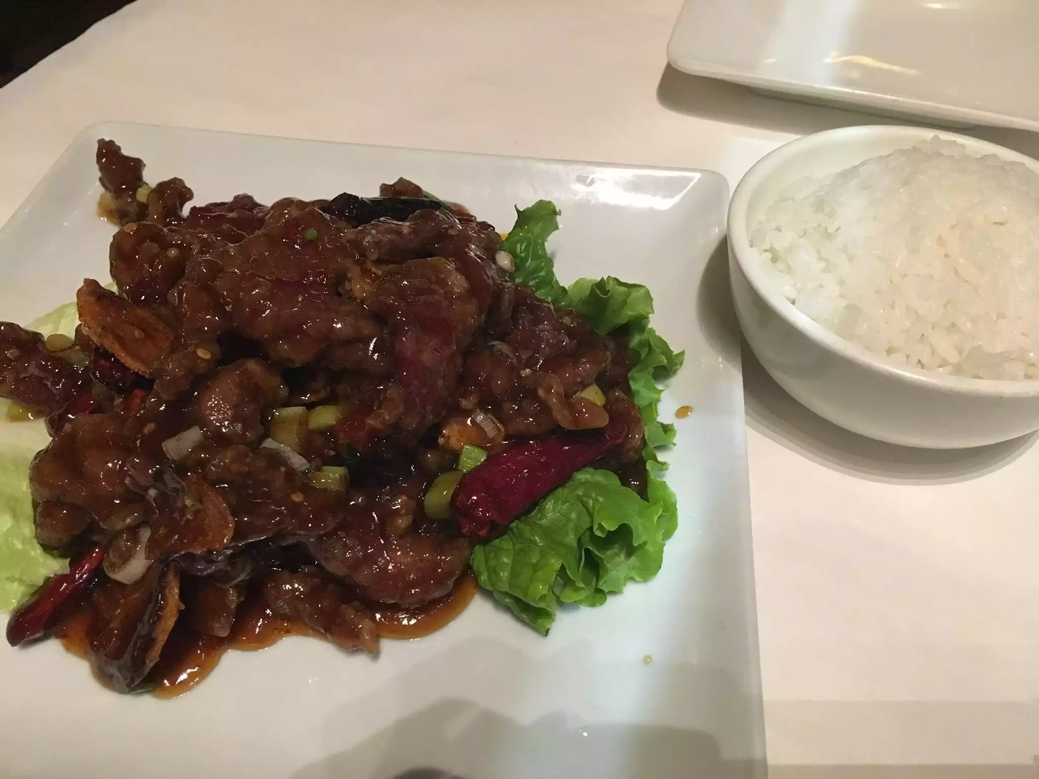 Three of us for early dinner. Prompt service, good food. They were almost in a hurry it seemed. Still, reasonable price for good Chinese. We are non spicy for the Grandchild that was along. Chicken w cashews was excellent. Broccoli w pork was undercooked to our tastes. Would go again. Chinese w tablecloths!