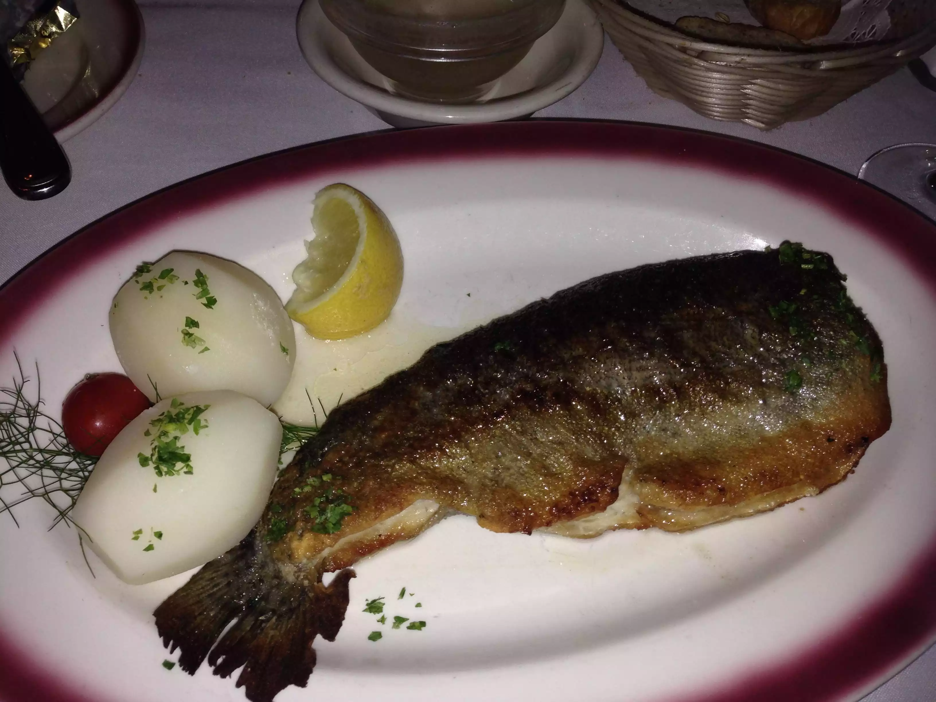 This was my second time visiting this charming restaurant. I got a weekday evening meal without booking, but the place was quite full; i think mostly locals. The serving staff are so charming, the place so atmospheric. My first visit i had veal kidneys, this time i had the special: pan fried trout. A disappointment. The fish was tasteless and grainy, the potatoes equally tasteless, like the pre-peeled ones that come in a big bag. A few green beans-an excuse for veggies. My partner had prawns- they were delicious. We tried to oder a souffle, but at 9 pm it was too late to order; it takes one hour to prepare-another disappointment. Remember; the souffle is outstanding- order immediately when you come in