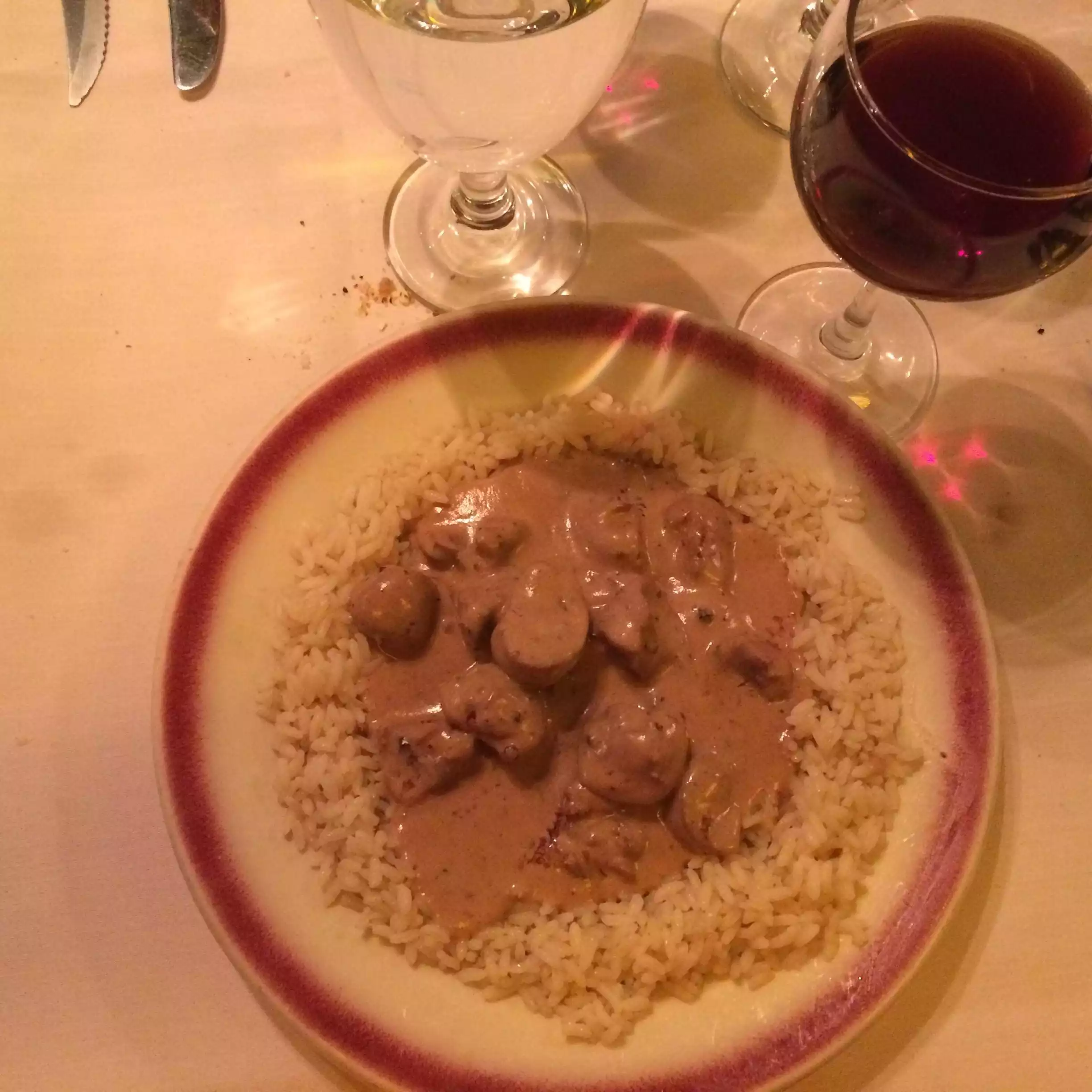 The interior is small and uninviting. Service is cordial and efficient. Bread was disappointing for a french restaurant. The veal dish consisted on two slices as thin as a turkey slice from a deli. Tasted ok but nothing great. The other dish was a beef in a brown sauce, a little on the heavy side but tasty. The table wine by the carafe was good a reasonably priced. Crème caramel was ok but I had better. In summary not a bad place but nothing special.