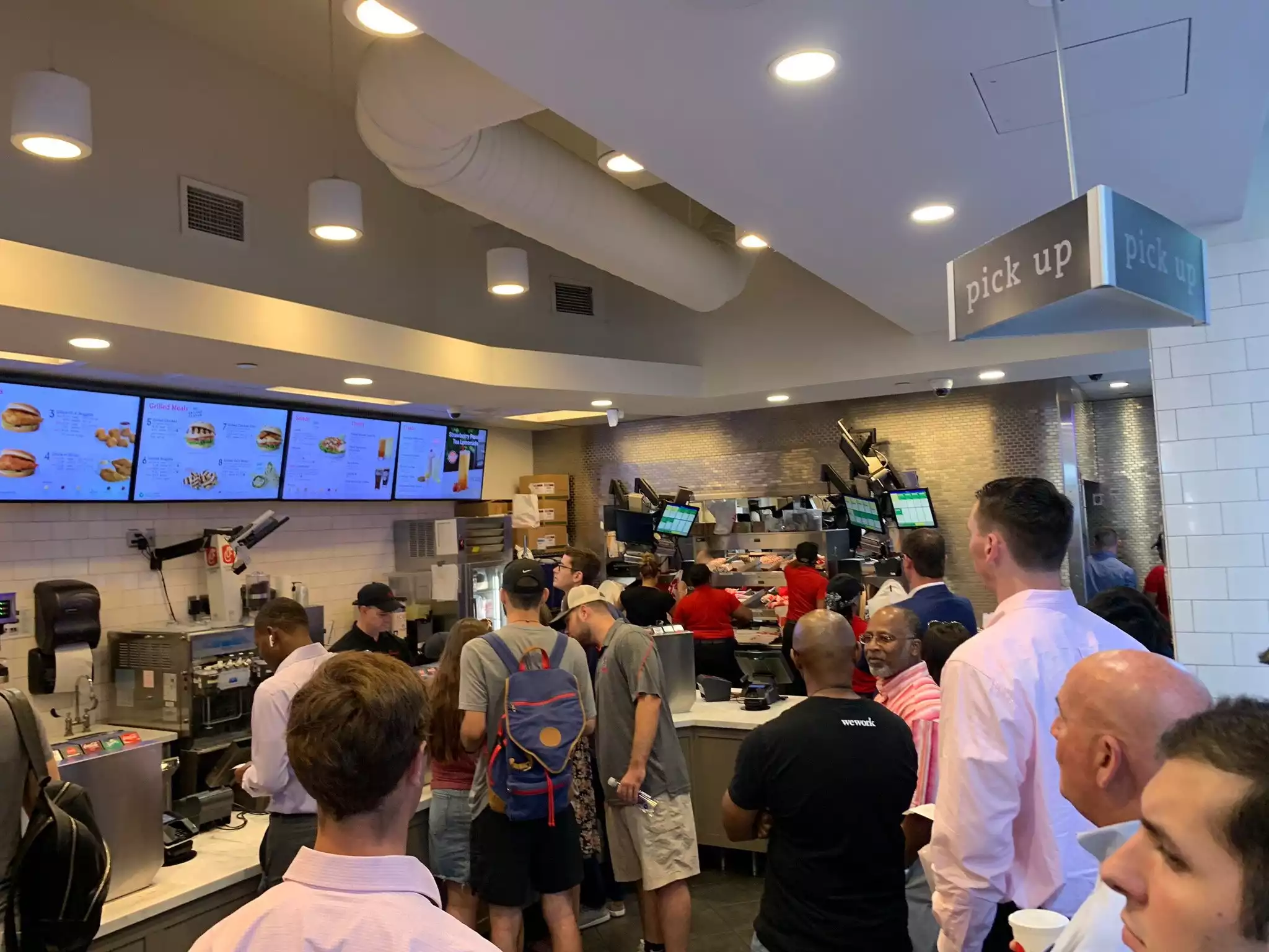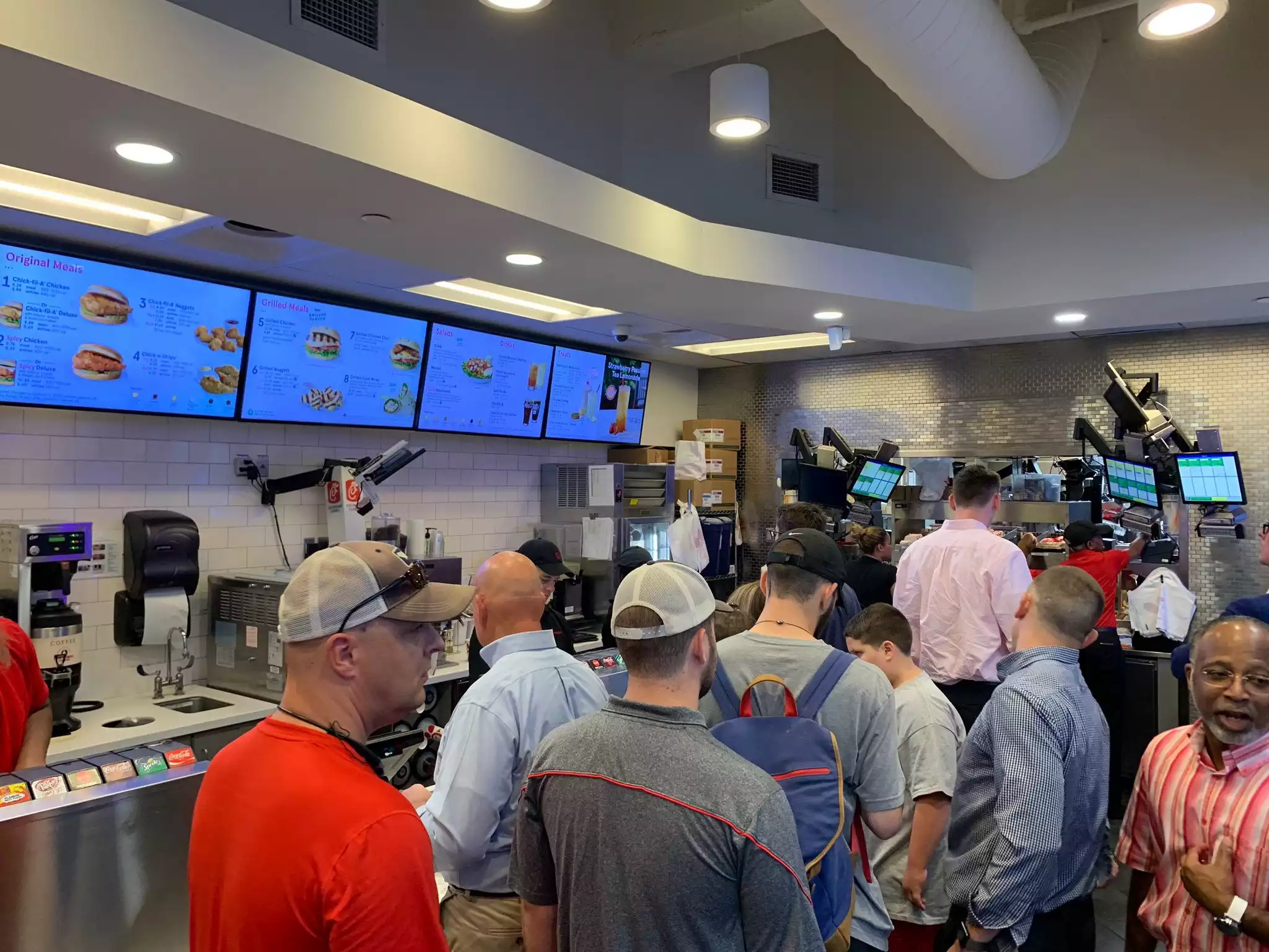 Everybody wants to eat here and the line to get in is quite long. nevertheless, there are scads of employees making the wait quite short. The food is predictable chick fil A and terrific.