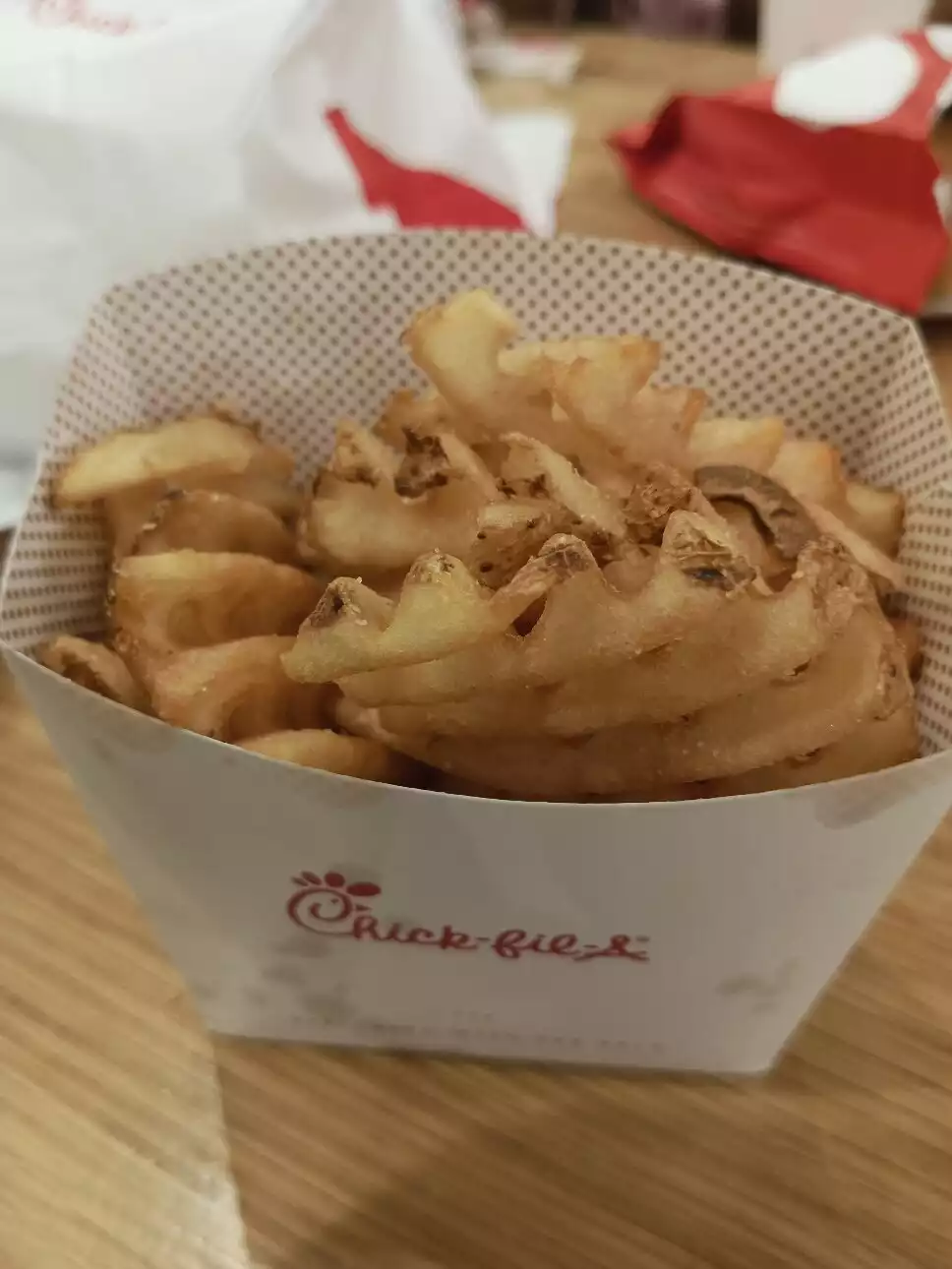 We have visited Chick-fil-A twice (within a week) and loved the food on both occasions. The restaurant was very busy but there were always people coming and going allowing us to get a seat. We had the spicy deluxe sandwich with waffle fries and Chick-n-Strips with waffle fries topped with Buffalo sauce and drinks. We found the food to be excellent on both occasions and left very full and happy. If you’re looking for excellent fast food at a reasonable price then Chick-fil-A is a must visit.