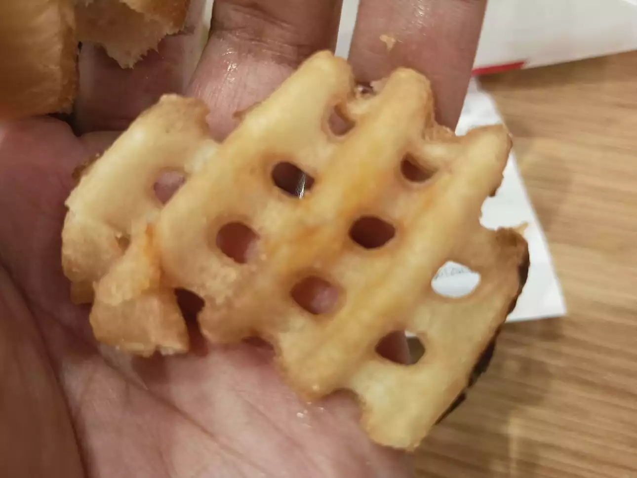 Lightly spiced burger and 'waffle' style chips. Chips were dry, no salt on them and the burger was average; not a patch on KFC