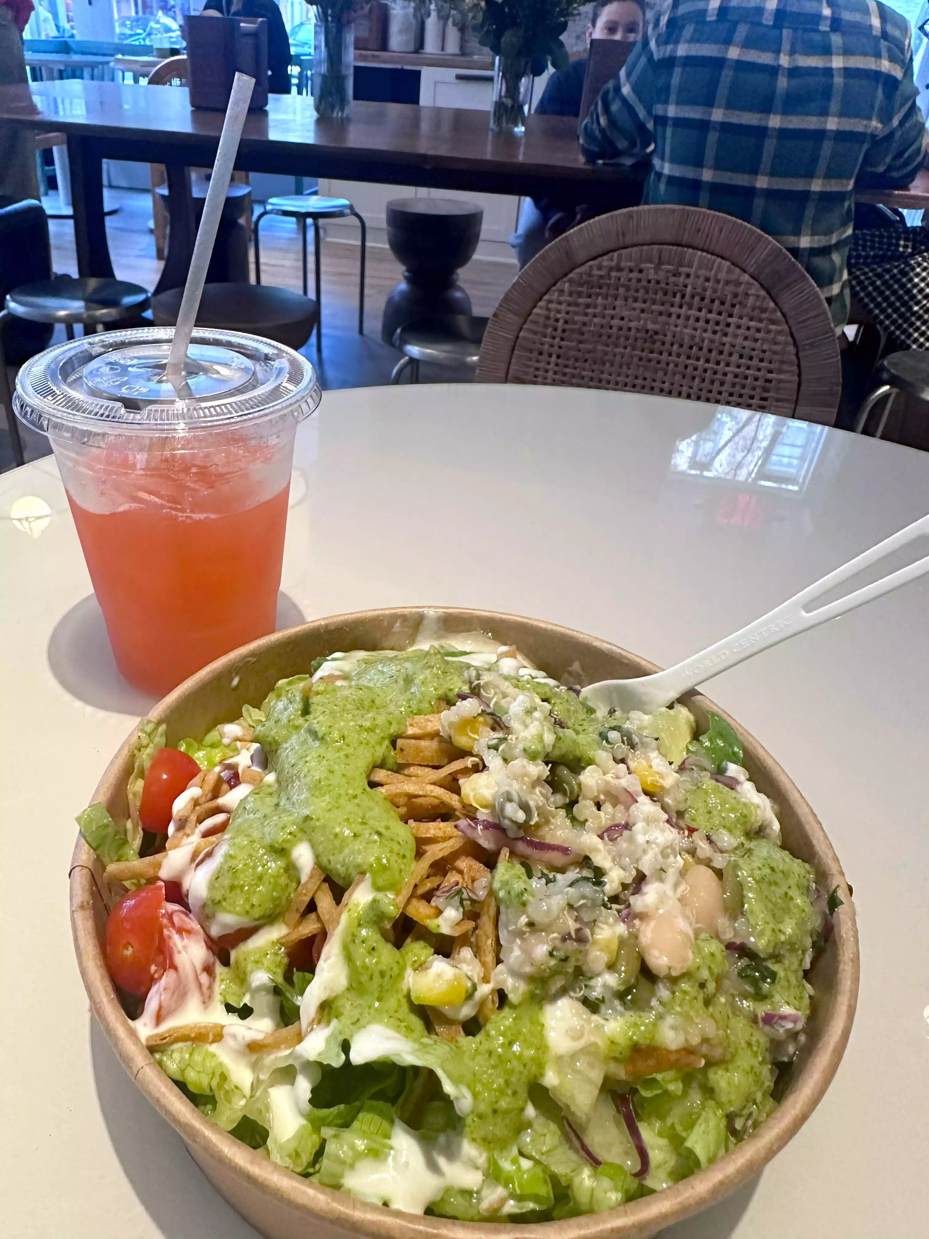 As a vegetarian (mostly vegan) longtime fan of Chloe Coscarelli' s recipes, I was very excited to finally try her cafe on Bleeker. The atmosphere is so cheery and inviting, and the food and drinks are excellent. I had a fresh, flavorful southwest salad, strawberry lemonade, and a piece of coffee cake; all were excellent! I wish I had a few more days in NY to go back and try additional items, such as Chloe's famous cinnamon rolls. Highly recommended whether you're veggie/vegan or not!