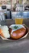 There is no inside dining here. You can sit at the bar or they have tables. The also have a fire pit which has seating. We were looking for a quick lunch before heading down fisherman's warf so we stopped here. It was close to noon so it was busy. We were seated right away but it did take a while for the waitress to come and take our order. I got a spicy fish sandwich that was delicious and we ordered the garlic fries as an appetizer which were yummy as well. It took quiet a while for us to ge the ticket but again in was noon and they were slammed. Overall this is a nice casual place for lunch or drinks and appetizers.
