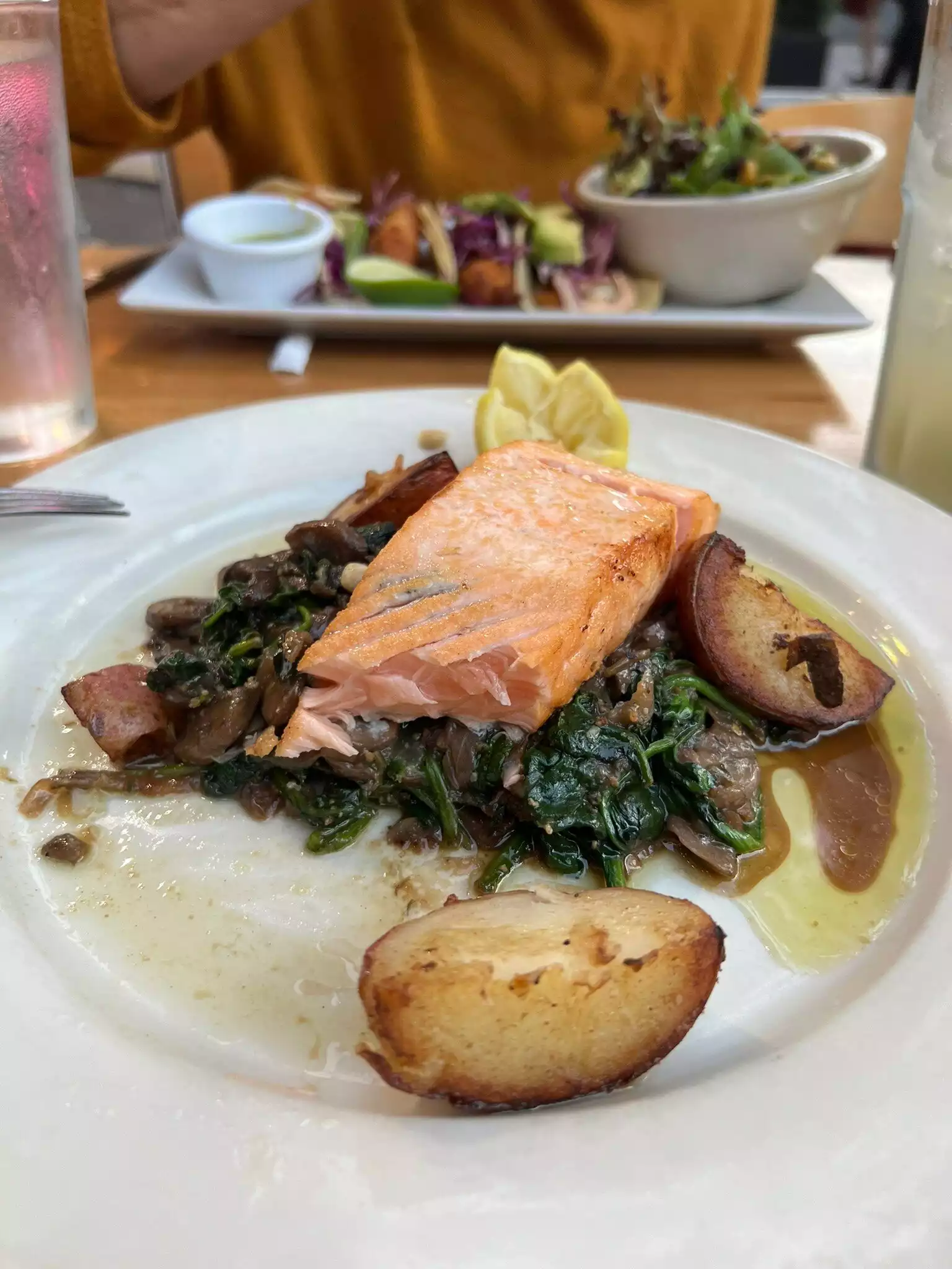 Enjoyed the queso fundido and salmon dinner. Salsa was fresh. Service was great as well. Dining available inside or out. Everything was very fresh.