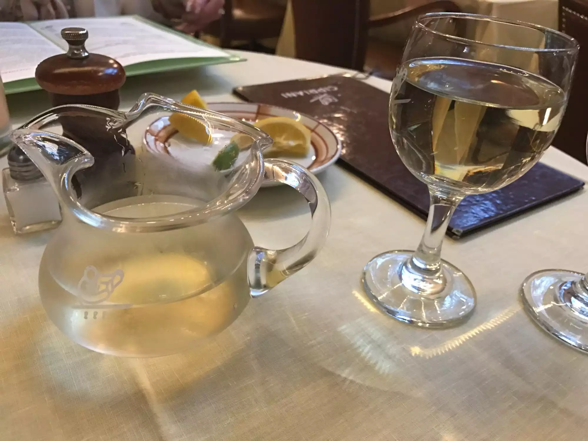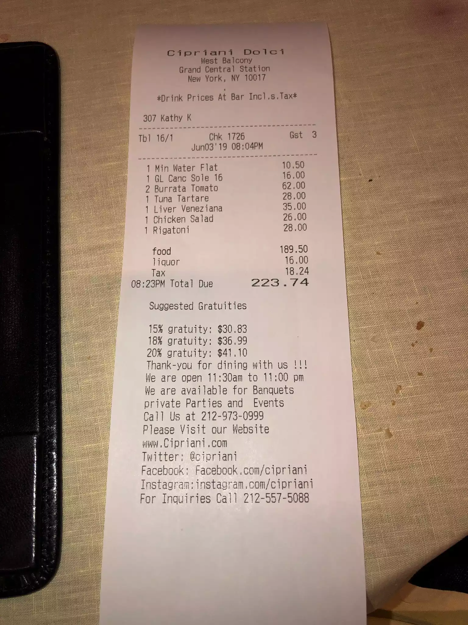 We visited Cipriani at Grand Central New York for our last night ' s holiday in NYC. We sat for a while, no drinks were offered for at least 10 mins although the place was not busy. So I called waiter and asked if we could order some drinks. " What do you want". He asked rudely. The meal itself was poor. All dishes were super greasy swimming in oil. We complained and in fairness once we finally located the manager he was very good and deducted the cost of two mains. The waiters were awful , they just stood around chatting never once asking after our meal etc. The GM was not on top of the staff checking they were doing their job. Overall a sad disappointment and a slur on the name Cipriani.
