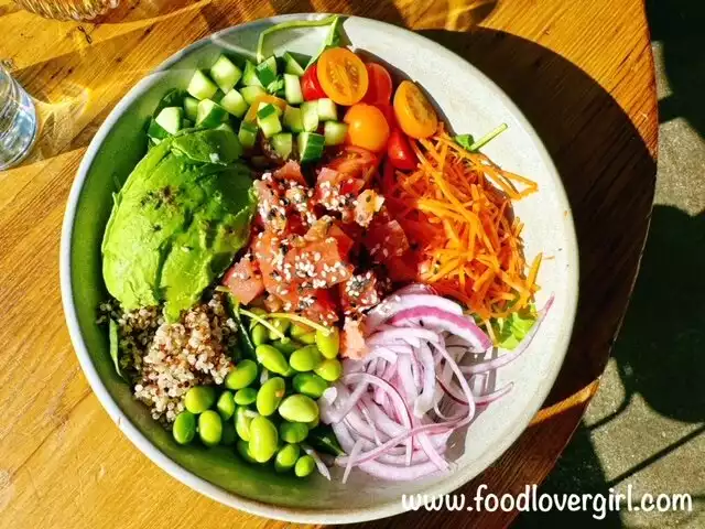 Lovely tuna salad bowl Many tuna and vegetables and seeds We had great time with live music Lovely water view I can see the little island next to it Great view day and night I will be back next time