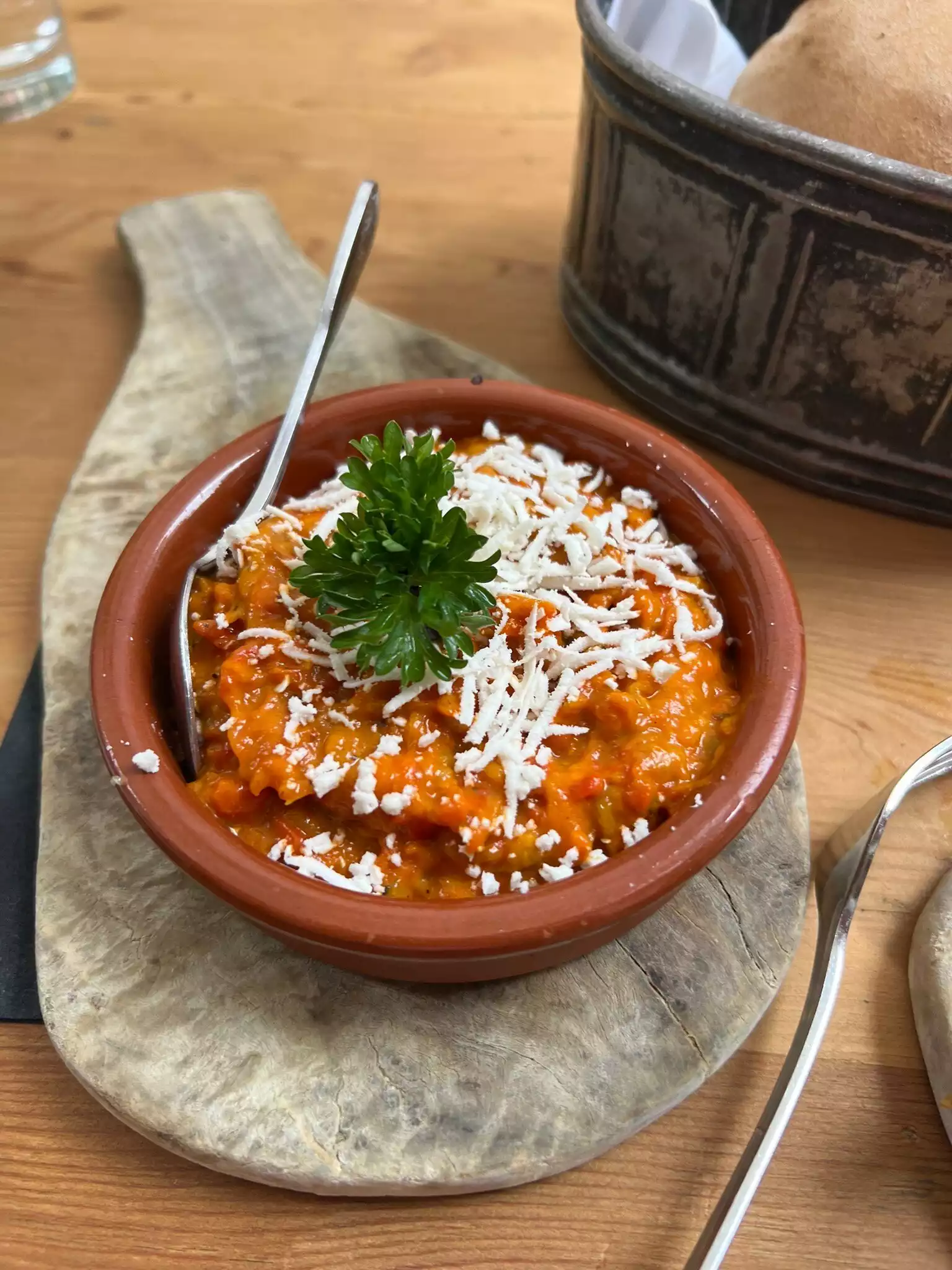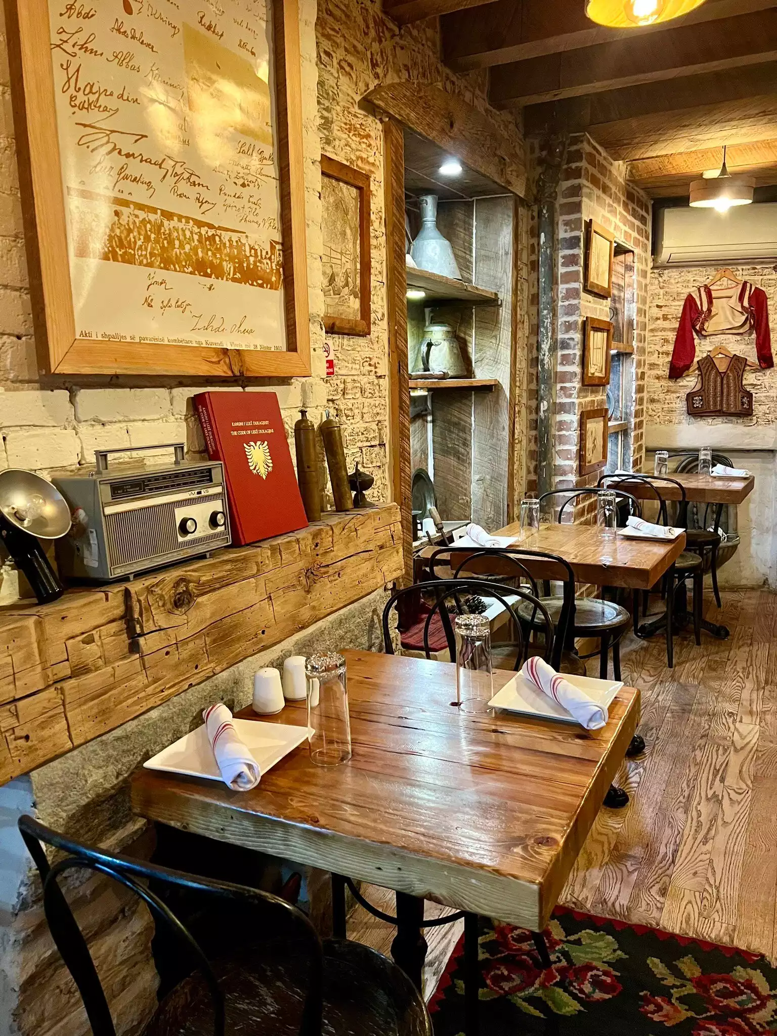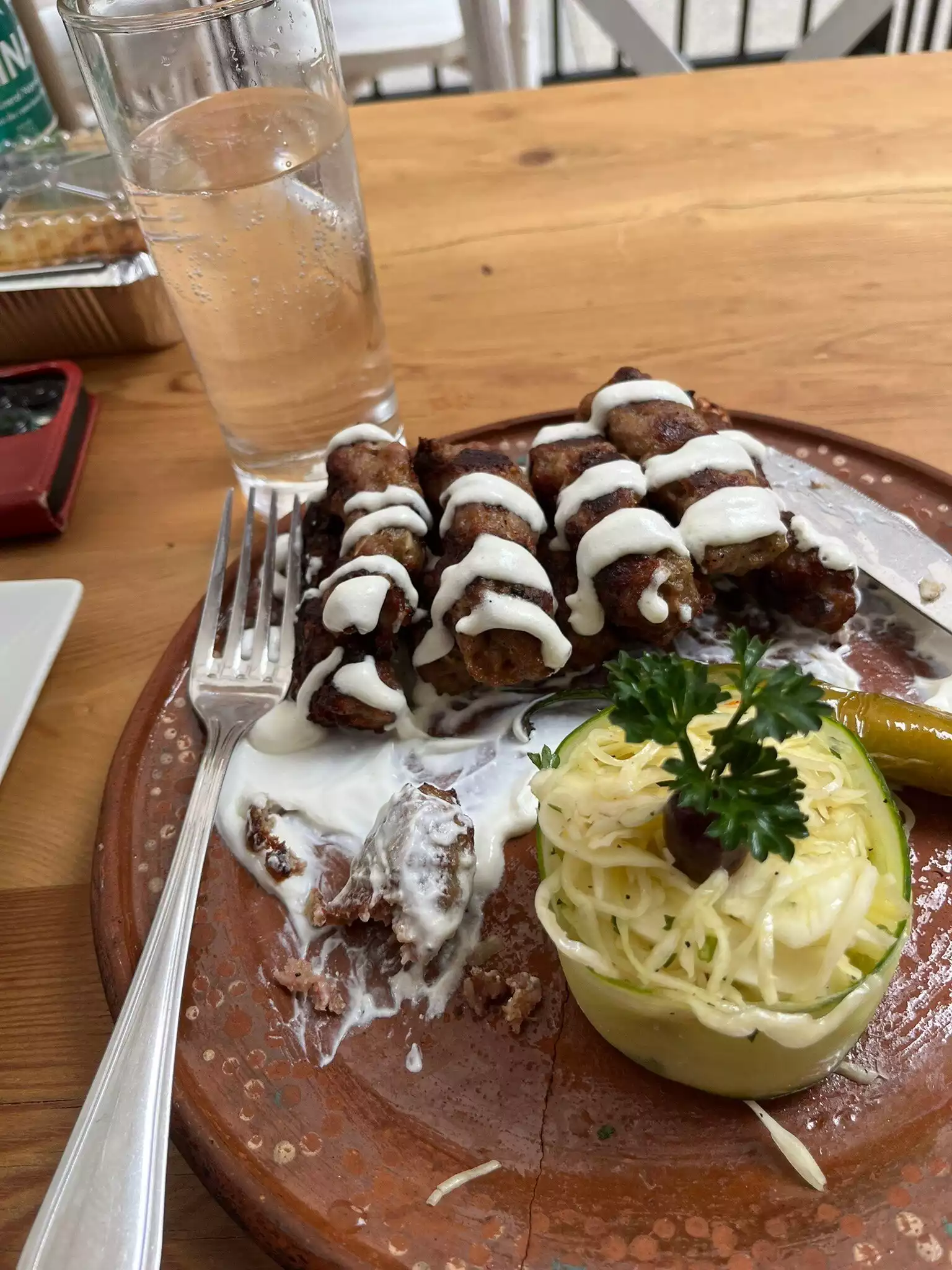 We chose this because it was open on a Monday evening. The food exceeded our expectations. We started with bread and roasted red pepper spread, and it set the tone for what was to come. I had the stuffed cabbage (Sarma) and my husband had veal meatballs in a yogurt sauce (Mantia). Outstanding. But we managed to find room for desserts! I had the Sheqerpare (almond pastry with lemon sugar syrup) and my husband had the Albanian trilece (a tres leches cake with a caramel topping). This is a meal we will remember!