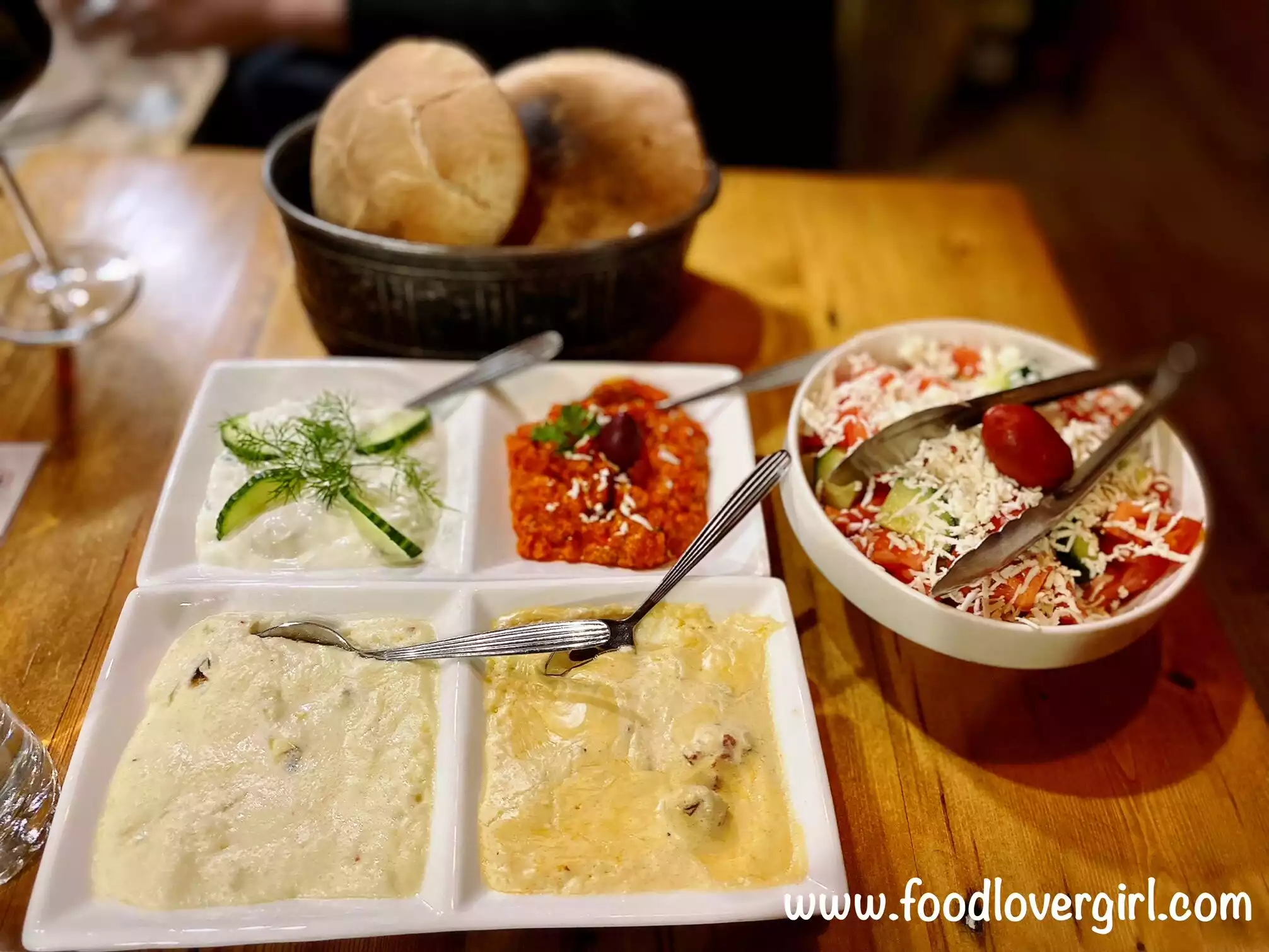 We recently went to Çka ka Qëllu, a rustic restaurant offering modern Albanian and Kosovan dishes. Once you step inside, you are transported to a warm, old-timey, authentic space. It is covered with wood and bricks, earthy tone that makes you think of grandparents’ or great parents’ home, maybe. There is a nice-size dining room at the front, and another dining room in the back. In between, there is a connecting space with a few more tables. For appetizer, we ordered some dips with bread and a salad. We want to try Mediterranean Salad or the Village Salad, but somehow, the server simply put in order for the Shop Salad… It seems like you need to demand what salad you want, otherwise, it might be selected for you??? Anyways, the Shop Salad was a really nice. For the dips, we got Tarator, Pickled Pepper, Sausage Dip, and Ajavar. The bread came piping hot! The inside was hallowed, made it easier to tear apart and dip into each dip. The creamy dips had more of a mild flavor, and the chilled ones had more distinctive, strong flavors. We enjoyed them all. For the main, we ordered Mixed Grill Platter to share. It comes with a combination of qebapa, qofte & sausage. They all had similar flavors, but all so tasty! Packed with flavors, so delicious. We ended our dinner with a dessert to share as well. We ordered Albanian Trilece. It was pretty darn good dessert! We had a nice dinner hear, certainly interesting. The service was not so warm, but our water was always filled, and we were well taken care of. A nice change from any other cuisine you find in the city.