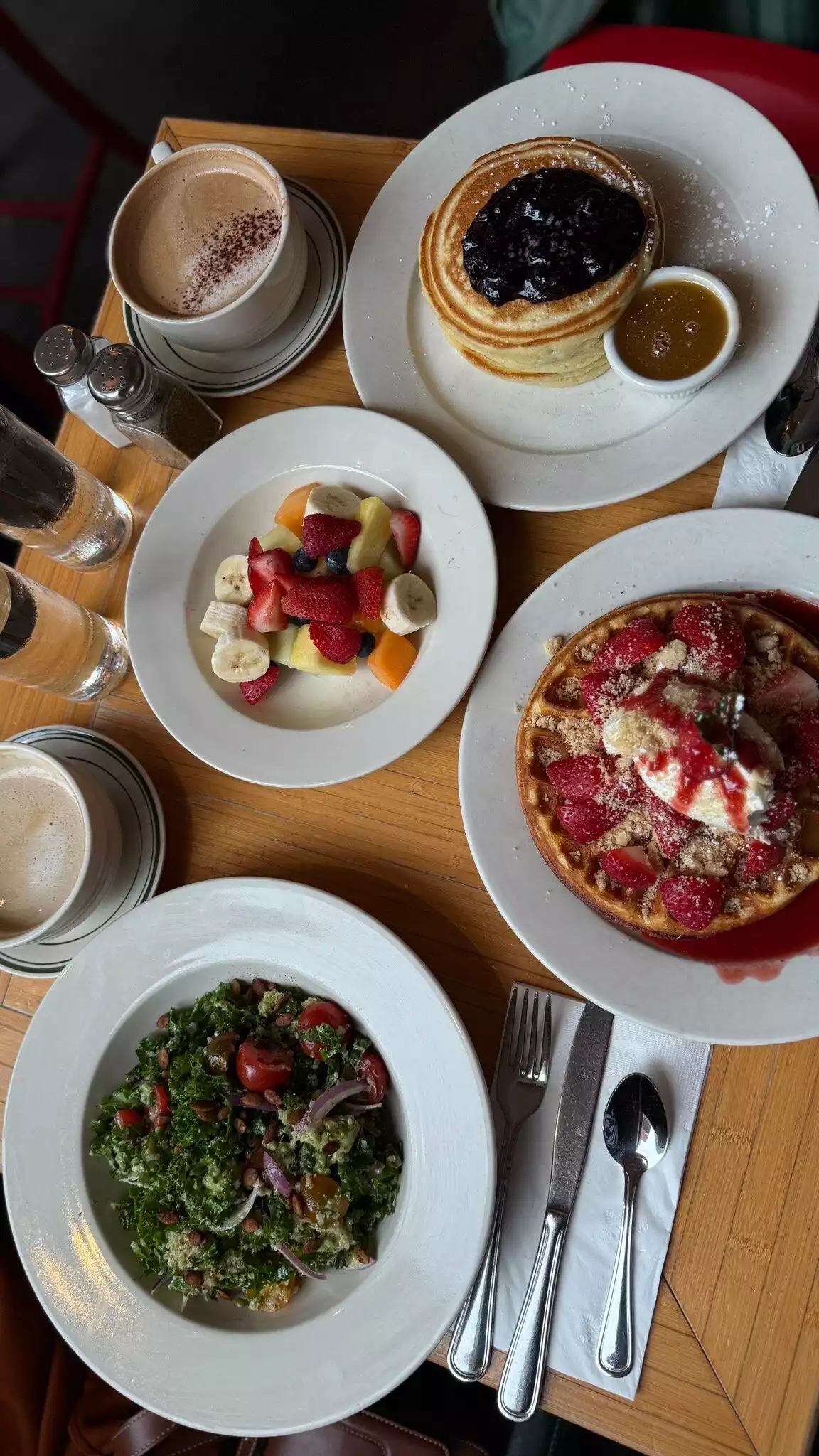 Check out my I G lawyer.traveler.dreamer for more footage of our experience. We turned a rainy New York morning into a cozy food adventure at Clinton St. Baking Co. Started with their famous blueberry pancakes—fluffy, buttery, and packed with warm syrupy berries. The strawberry shortcake waffles were crisp and topped with fresh cream and strawberries. To balance the sweetness, we added a fresh kale salad and a vibrant fruit salad that tasted like summer. Two flavorful lattes kept us warm and happy while the rain poured outside. Everything was delicious, the vibe was cozy, and the service was quick. A perfect breakfast spot to lift your mood on a gloomy day. Highly recommend!