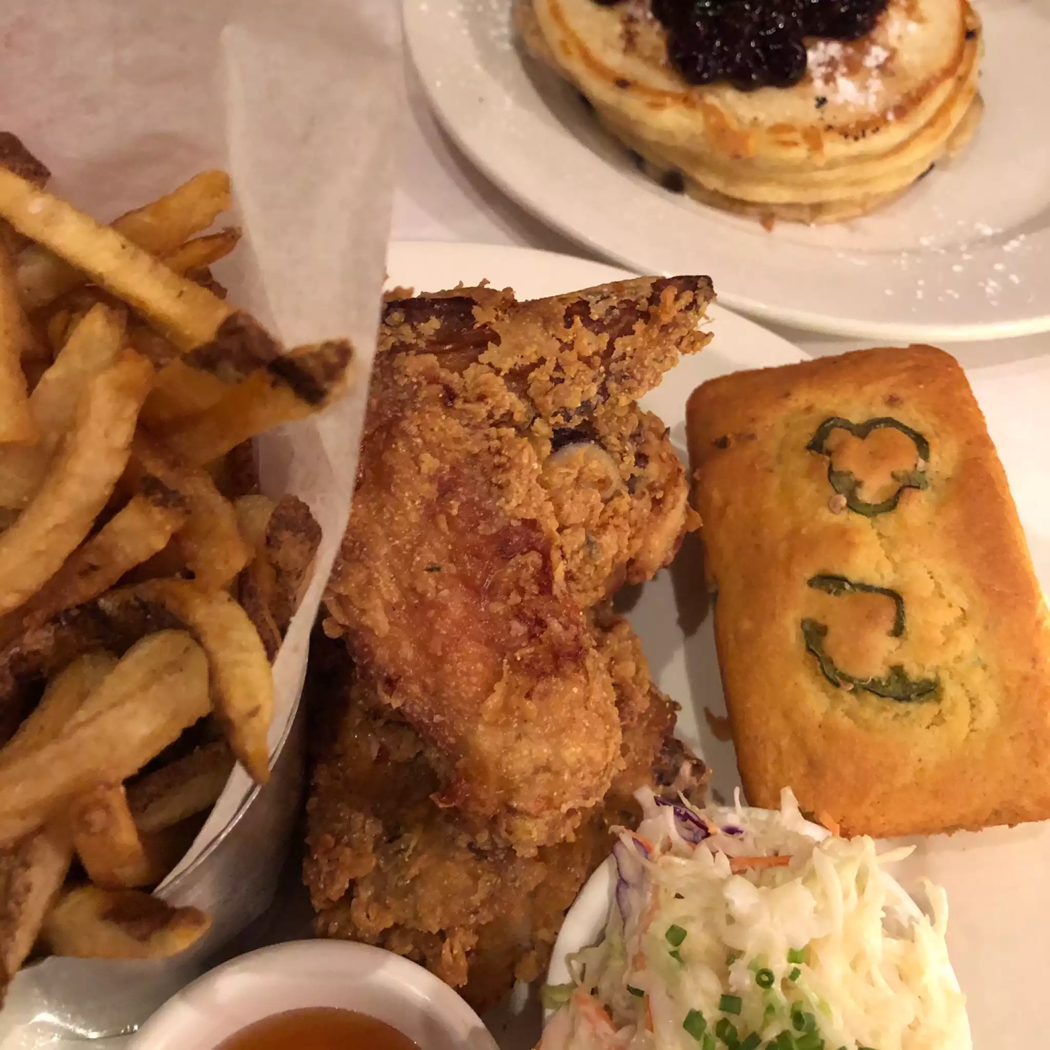 It was fast and busy but the pancakes were delicious. We had booked which is advisable as it’s a real popular place. Husband had chicken and waffles and did not need to eat anything else all day. Huge portions. Very good