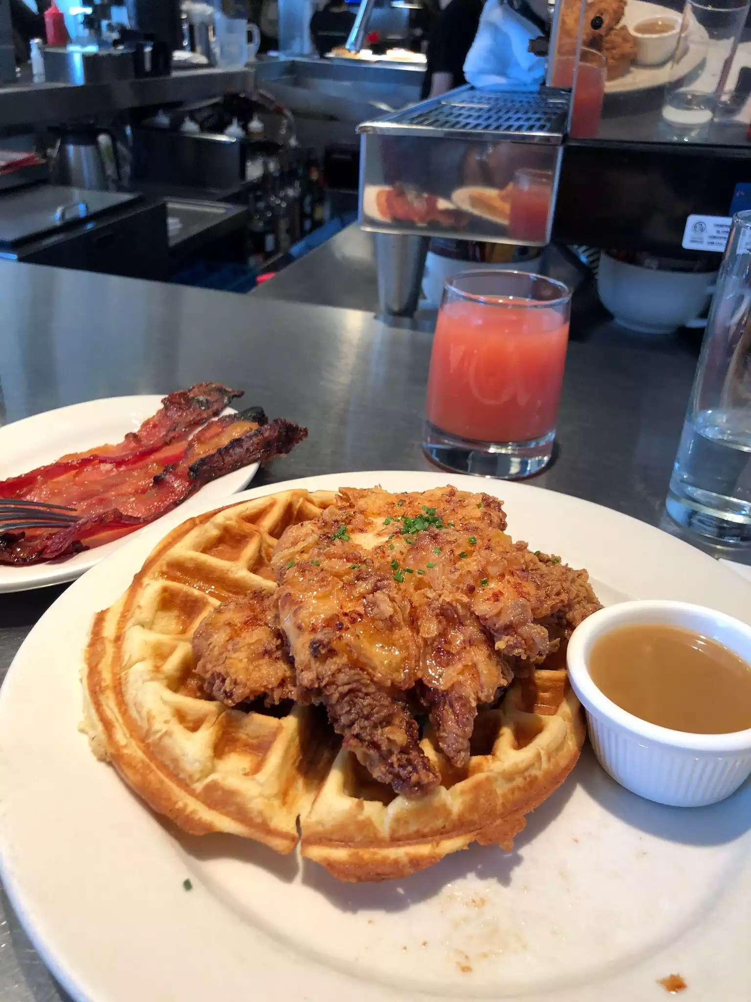 I went here a couple of times in 3 days and had my hotel been nearer I would have been back even more!! Absolutely delicious pancakes and the maple butter is out of this world. Great blueberry compote and the side of sugar bacon was wonderful. This is one of the tastiest meals I’ve ever had. The other day I had the chicken and waffles. This was just as good as the pancakes!! Waffles - you can really taste the buttermilk and the chicken batter was so thin and crispy! On top of all that - absolutely perfect service can’t want to go back!!