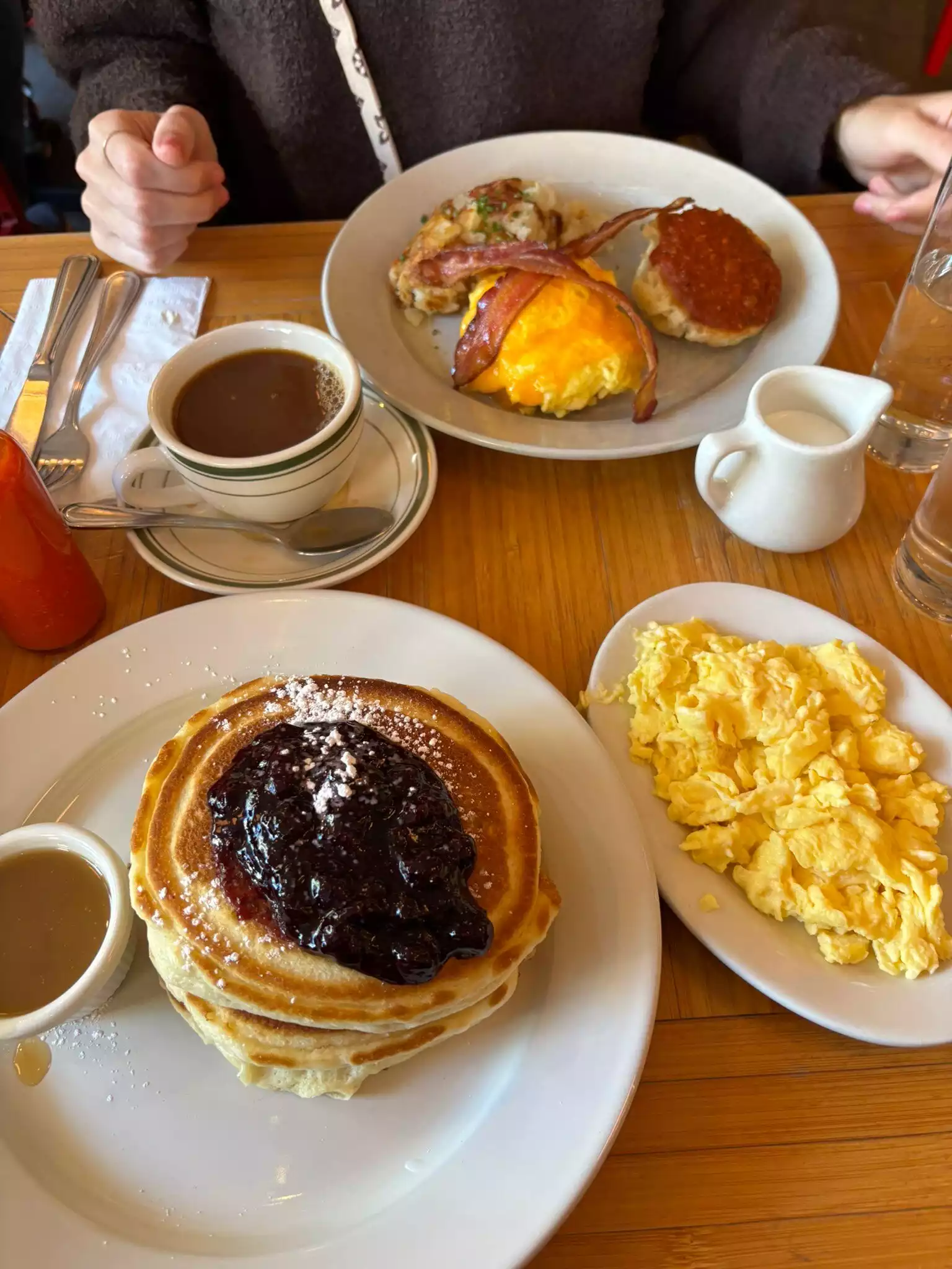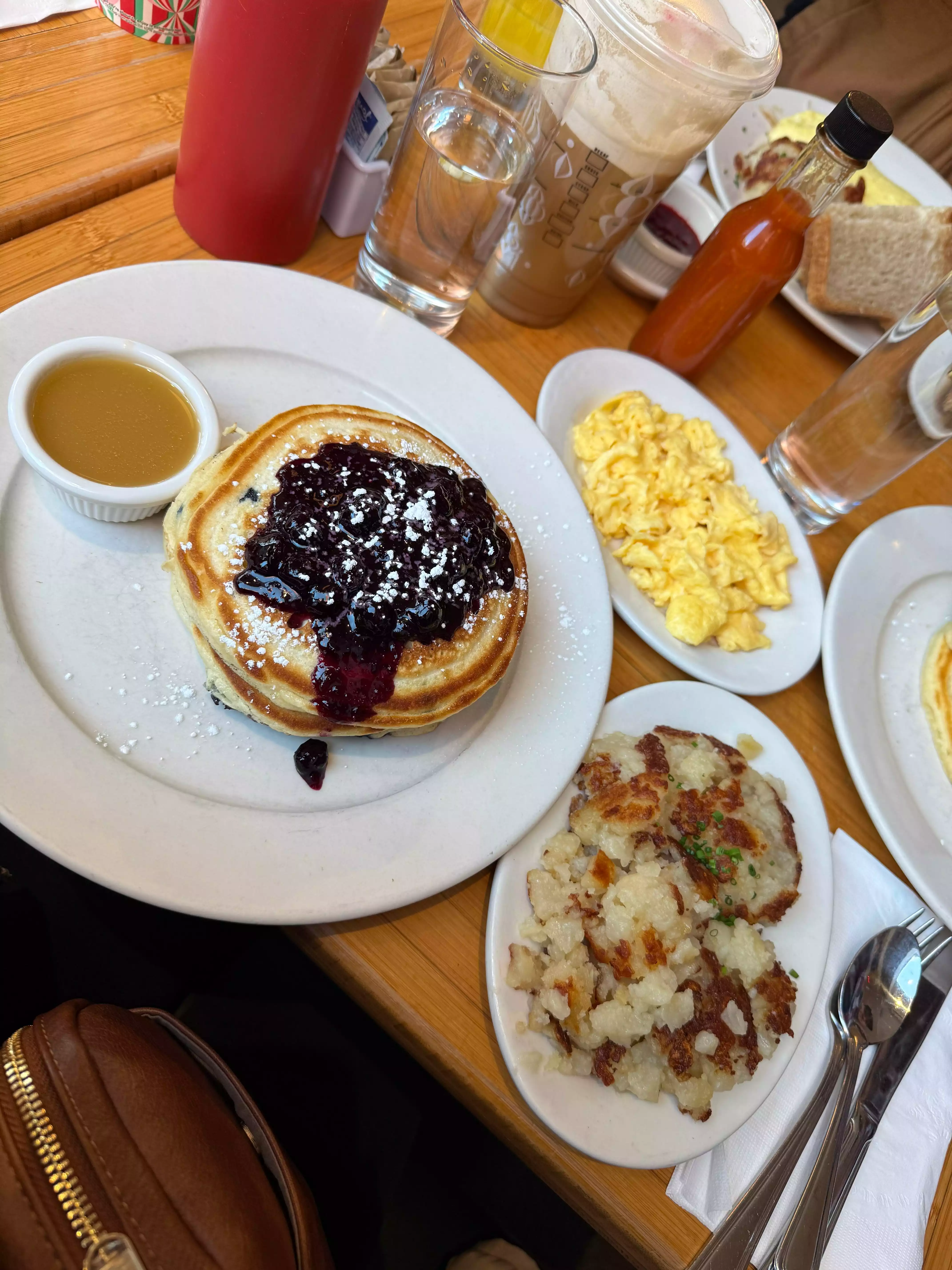 So let me start by saying I am a huge foodie and this was THE best breakfast I’ve ever had. The blueberry pancakes, the maple butter, the potatoes, the eggs..all absolutely amazing. Our whole group loved their food and we felt it absolutely was worth the hype we’ve seen on social media. By FAR the best breakfast of the trip & quite literally, the best I’ve ever had. The negatives: service. Our server was hardly existent. No one ever checked on us after we got our food until they brought us our check (which somehow had extra items on it?) ALSO, the way they deal with reservations was so incredibly odd and allowed for incredibly rude situations to occur. We were the first people there, starting the line over 30 minutes before they opened. The line quickly formed and was wrapped around the building. Yet, groups of people with reservations (which I had seen they DID NOT do on Saturdays, guess that was wrong) shoved their way past us inside first? Maybe this is a thing here, but it felt insane to me. For us to stand in the cold for 30 minutes and then allow rude customers to just skip all of those people? No. Not as important, but the lady in the front who literally screams at everyone to shut the door was also so annoying, we heard it said probably 30 times during the duration of our meal. Pricing was also unreal lol. For the $18 pancakes to come with no sides is wild. It was $33 for me to get pancakes, a side of potatoes, and a side of 2 scrambled eggs. I guess when the food is that good you can charge that, but it was pretty insane pricing. Like I said, food was amazing though. Service was just crappy.