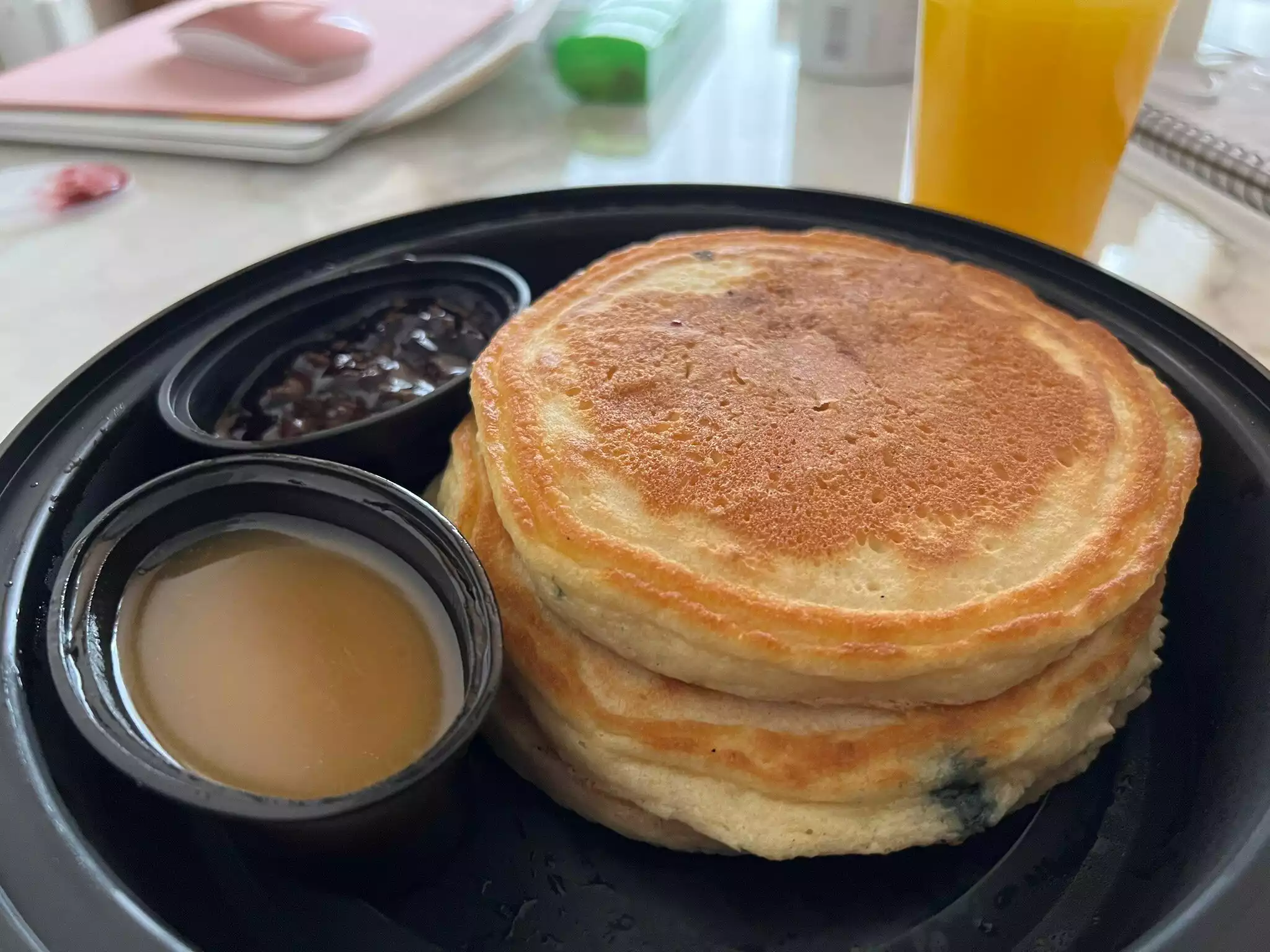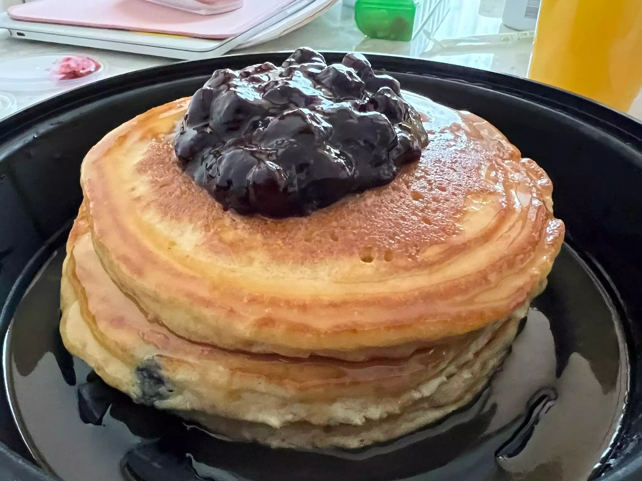 Best blueberry pancakes ever! The pancakes are served with warm maple butter and blueberry compote. Truly next level even as takeout. Muffins and scones also delicious! We went many times over three weeks and always got takeout due to popularity! I will mention that they also have a very tasty crispy chicken sandwich for lunch or dinner!
