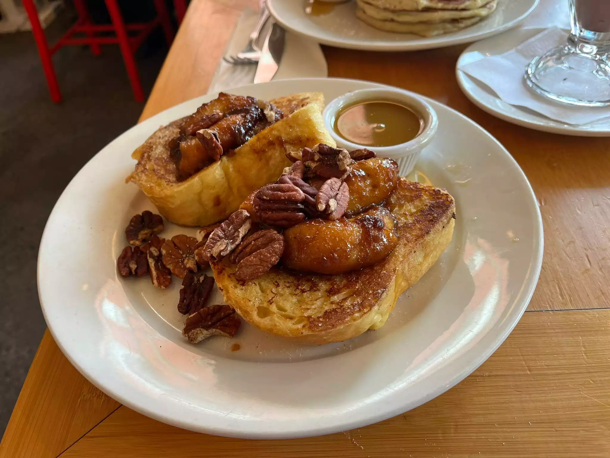 We came here a long time ago when it was tiny and really enjoyed our meal at the time so we were excited about coming back. We got there right as the doors were opening and there was already a long line. They will not seat you unless the entire party is present but it was just the two of us so no problem. They also tell you right away that it’s cash only. I got the impression since there were so many people waiting that they wanted to keep us moving along and not linger over breakfast. The only butter was foil wrapped and very cold so it could not really be spread over the pancakes - which we wanted to have without fruit or chocolate on top. Also, there was no regular syrup - just the caramelized praline-like sauce. I thought it was yummy but hubby did not like how thick and sweet it was. Granola was a little bland and not very crunchy. Definitely not the lovely experience we had years ago.