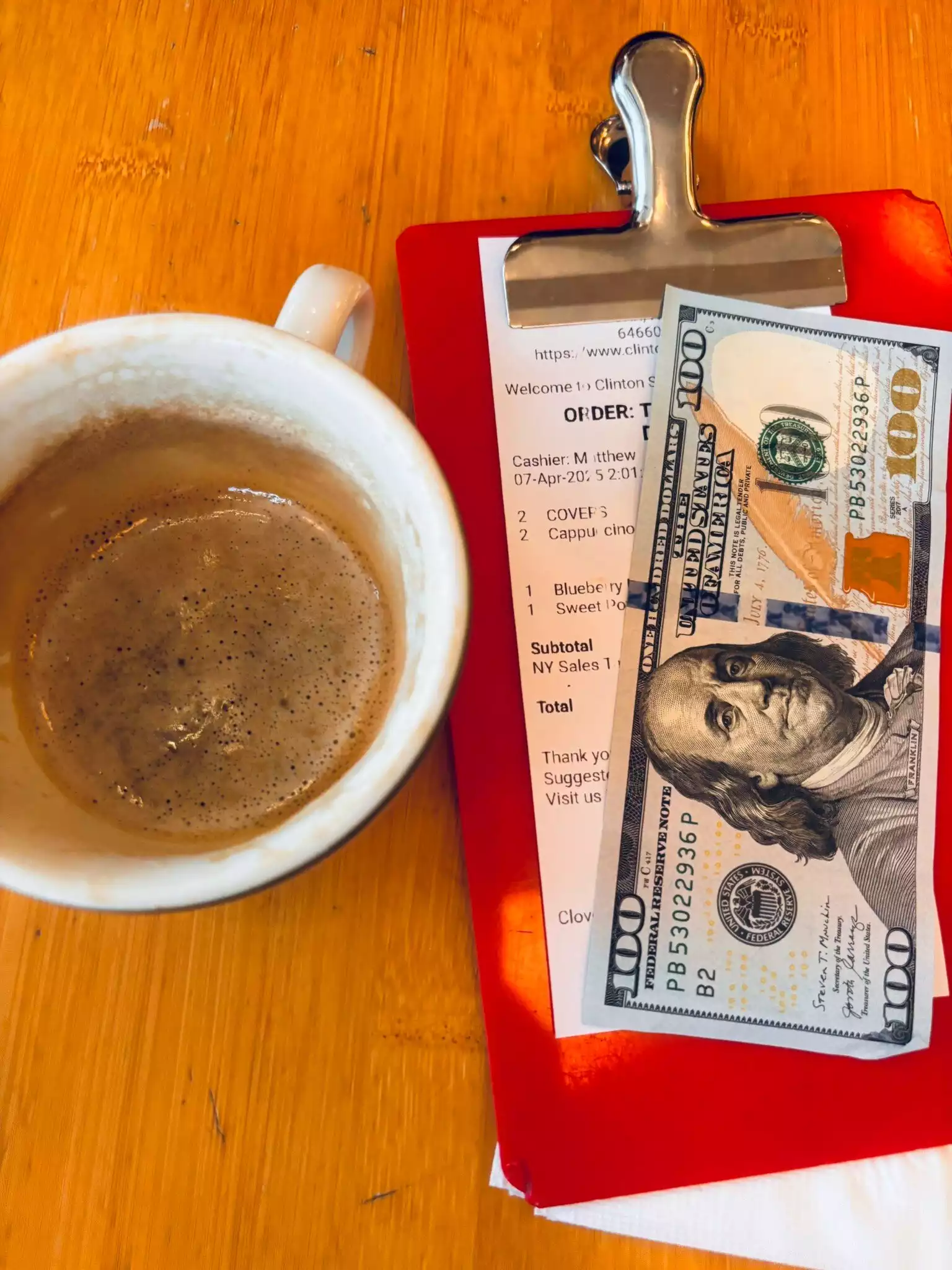 I gave up waiting on line for breakfast, so jumped at the chance to have breakfast for dinner. Here’s the deal: We made a reservation for 8 pm. A few hours earlier tried to make the reservation for 7, but at 4:30 no one answered the phone. We went back to Resy and they said no availability. We got to restaurant at 7:45 and it was basically empty. So, restaurant, figure out a way to better manage your tables. Now the food: I had the pancakes with bananas. they put the bananas on the top, none inside. Isn’t that how it’s done? They also put cinnamon sugar on the top - not mentioned on the menu as an ingredient. I can’t stand cinnamon, but decided not to “complain.” So ate without saying anything. The warm maple butter is sooo sweet had to ask for regular syrup. We also had the salmon and latke hollandaise. Both were good. We also had the chicken and waffles. My daughter who ordered this also thought that the maple butter was too sweet, so she asked for regular syrup for her waffle. She was told that if she got that they would charge us an additional $2. Unless we gave the syrup back. Really? I told the waiter to take mine back, knowing I was not going to eat it. However, I should warn you, I did put my fork in it to taste it. Not good quality control, restaurant. Finally, I would add that when we arrived at the restaurant, there was a full, overflowing, garbage pail right next to the host/hostess stand. It was pretty much a turn off when we arrived. I also noticed many of the tables were empty but had not yet been cleaned. And then when we left an hour and a half later, the garbage pail was still overflowing, never dumped. Needless to say we were quite disappointed. Not sure a return visit is in the cards. Sorry, Clinton Street.