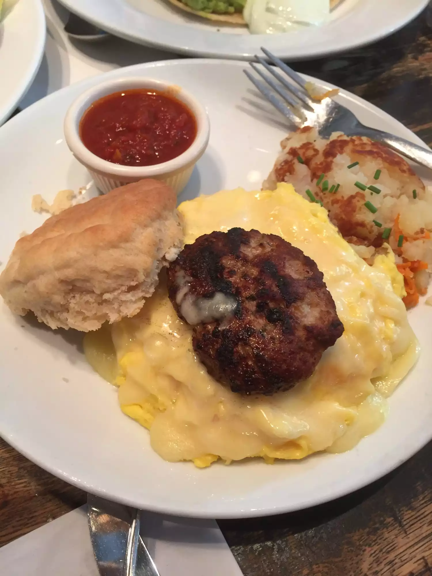 ...a buttery biscuit, an enviable egg scramble and melty cheddar cheese. And it was cool enough and quiet enough to eat on the sidewalk (restaurant side not street side).