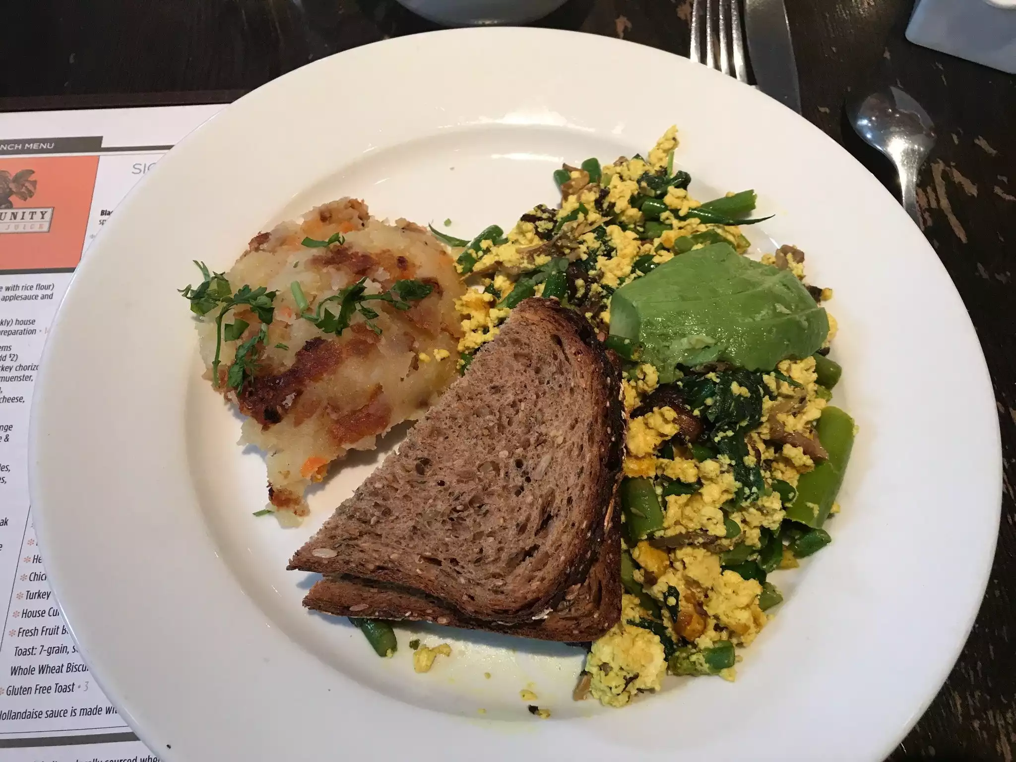 Last Saturday we had breakfast at Community. We were 3 adults with 2 dogs and they sat us outside and brought a bowl of water for our pups- which was very thoughtful. I had the Greek Yogurt with granola, fruits, berries and honey. Absolutely delicious! My fiancée got the Pancakes with Blueberry on top and my friend got the Country Breakfast. Please note that it comes with carrot hash browns- which is not the norm but still very tasty. The waiter was attentive even though they were busy. I’ve had breakfast around the neighborhood and I have to say this is one of the tastier meals I’ve enjoyed. Will gladly return to Community.