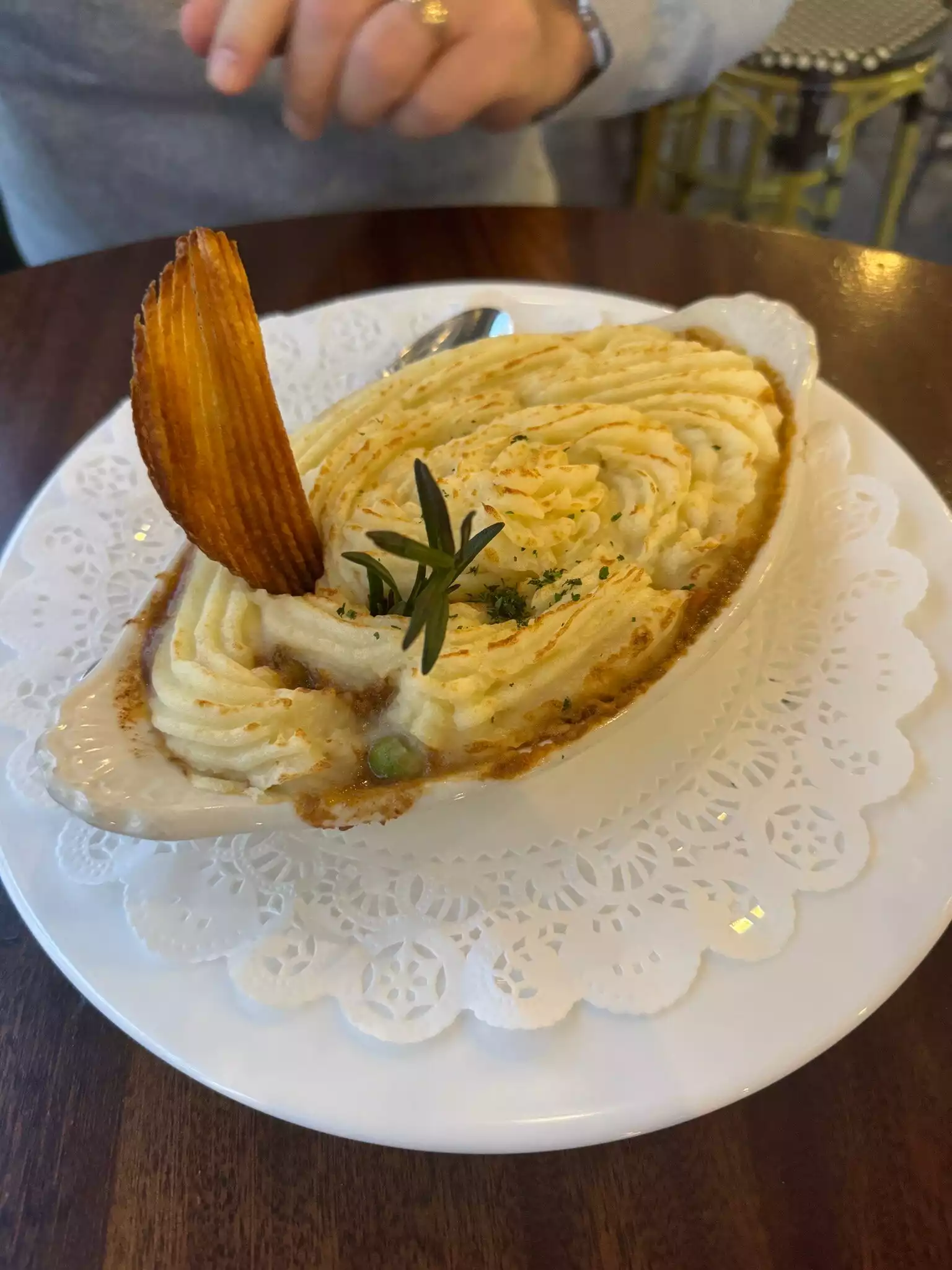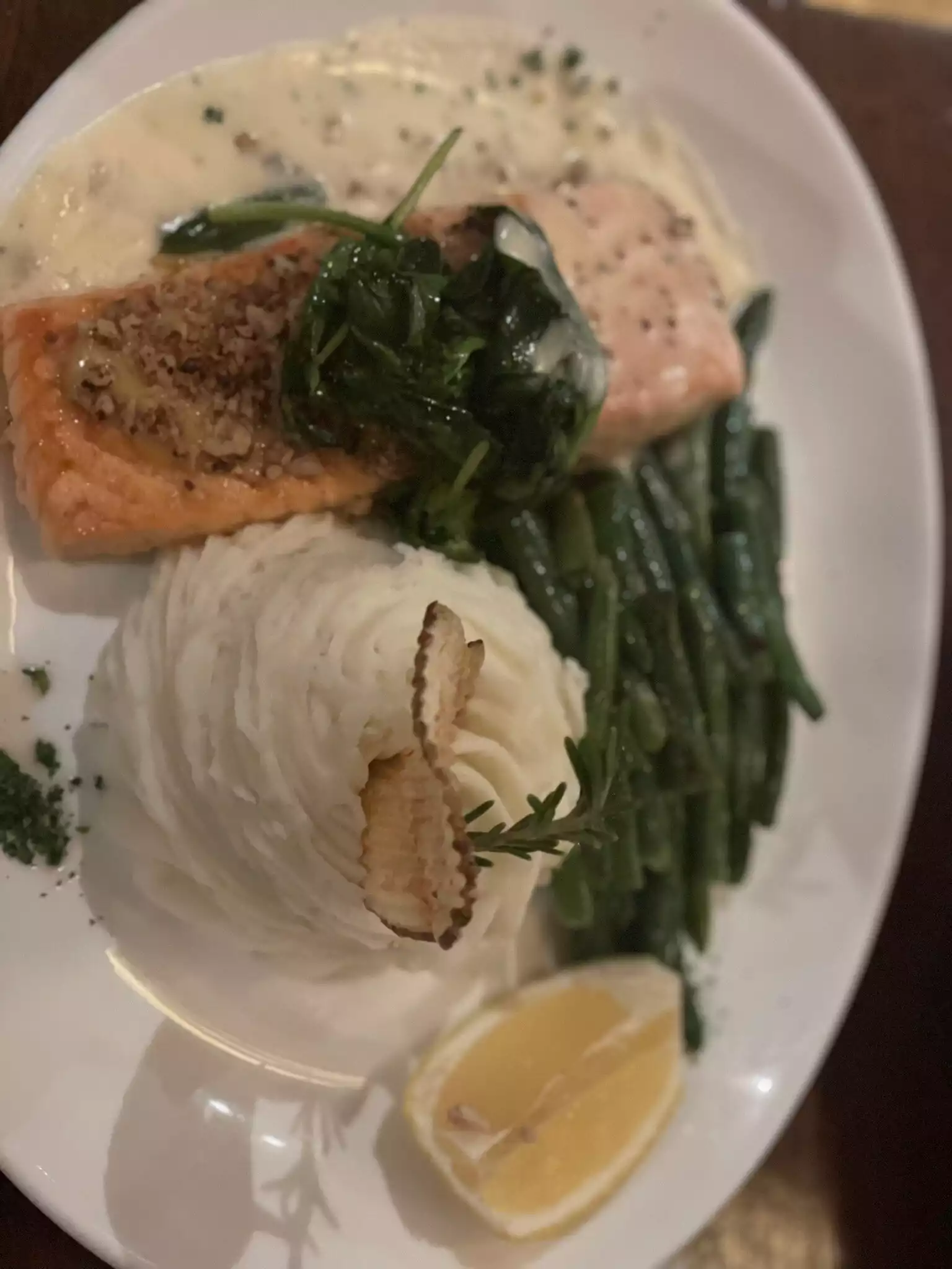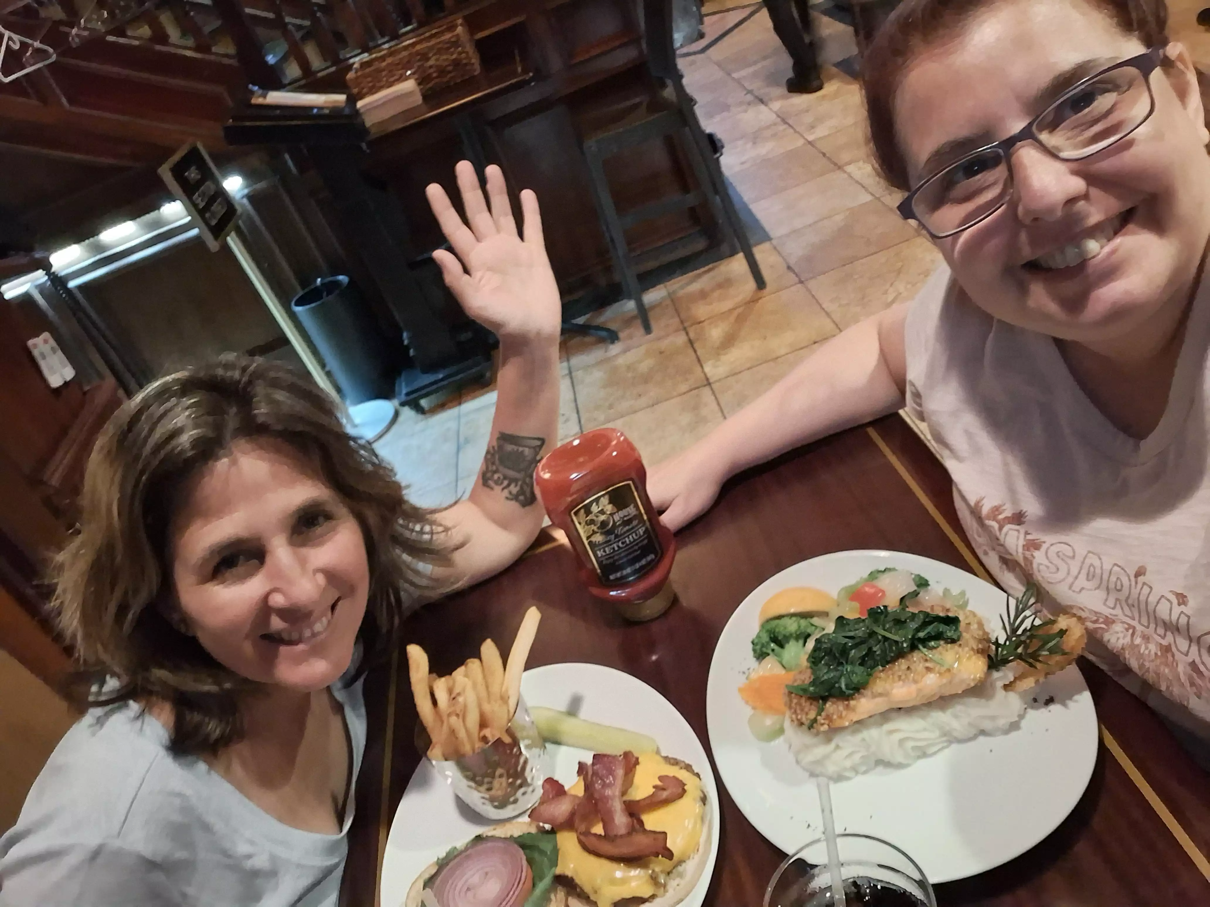 Our server was great, funny, attentive but not annoying. Burger wasn’t cooked right (MW not MR), so wasn’t juicy and a bit dry. chicken pot pie was good though. Creamy flavorful. Food served quickly.