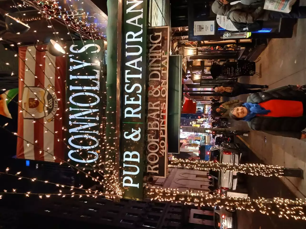 Along with my wife Geraldine I celebrated the New Year in the Times Square area New York. I’d done a bit of research for what bars were in the area with Connolly’s coming up as one of the closest. During our first full day in the city we decided to give it a go for lunch and was greeted and seated at our table by Mairead who was warm and friendly and attended to all our needs. The food was so good we returned the following morning for breakfast and once again Mairead was there to serve us and once again the food didn’t disappoint. We were back in the following morning, which was New Year’s Eve and was looked after by Ruth and Eireann who both were full of fun and warm hospitality. With it being our first New Year in New York, we asked did we need to book to use the Pub / Restaurant, the answer was yes, however Ruth immediately said not to worry and we was welcome to join them, which was an extremely kind gesture. We’ve spent some time at Connolly’s during our New York visit and it’s run like a very well oiled machine with all the staff being friendly and efficient. For anyone thinking of visiting there, the Guinness is perfect, the Full Irish Breakfast is substantial and quality, and the Irish Beef Stew is to die for. A Big Thank You to Ruth, Eireann, Mairead and all the staff for their warm hospitality and it’s one place we will certainly be returning to.