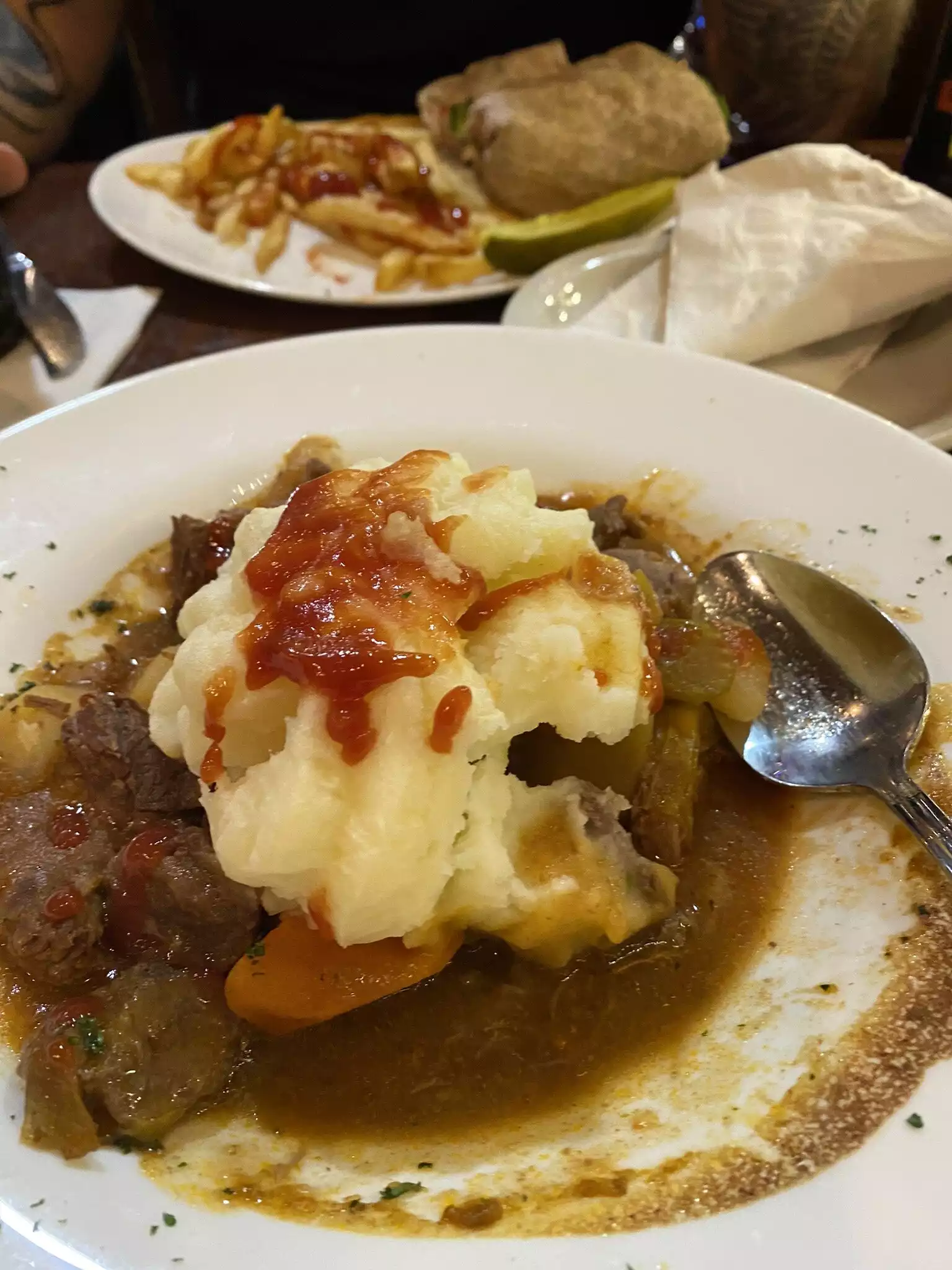 So we had dinner here the day after St. Patrick’s day . We were told they were so busy on Pats day they may be out of some things but they had what we ordered . Started with a couple of beers and really enjoyed the Guinness . I had the Irish beef stew , and while it was enjoyable there were about six bites of beef , the rest being potatoes . For a main course at a pub , that was very disappointing . I left hungry as we did not have any appetizers because none seemed appealing to us as we are staying away from fried food . My wife really enjoyed the turkey burger and fries . We will be back and try other entrees