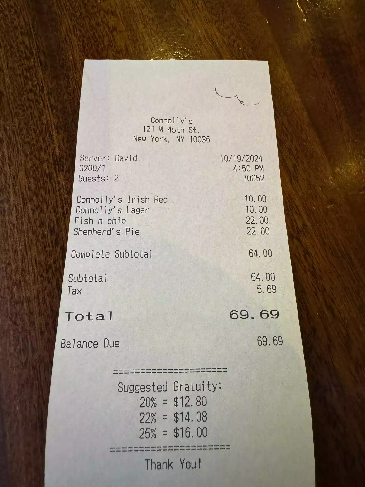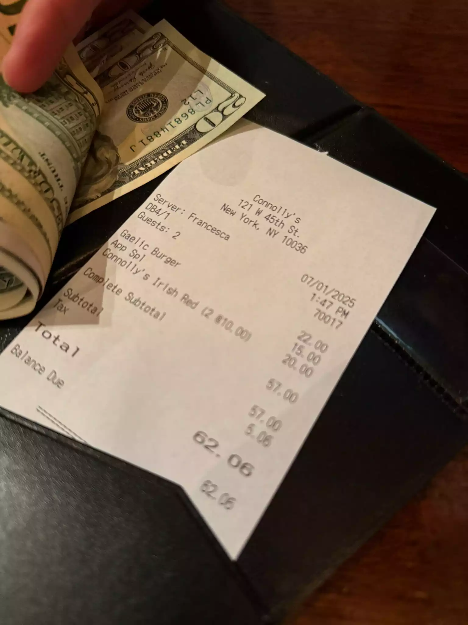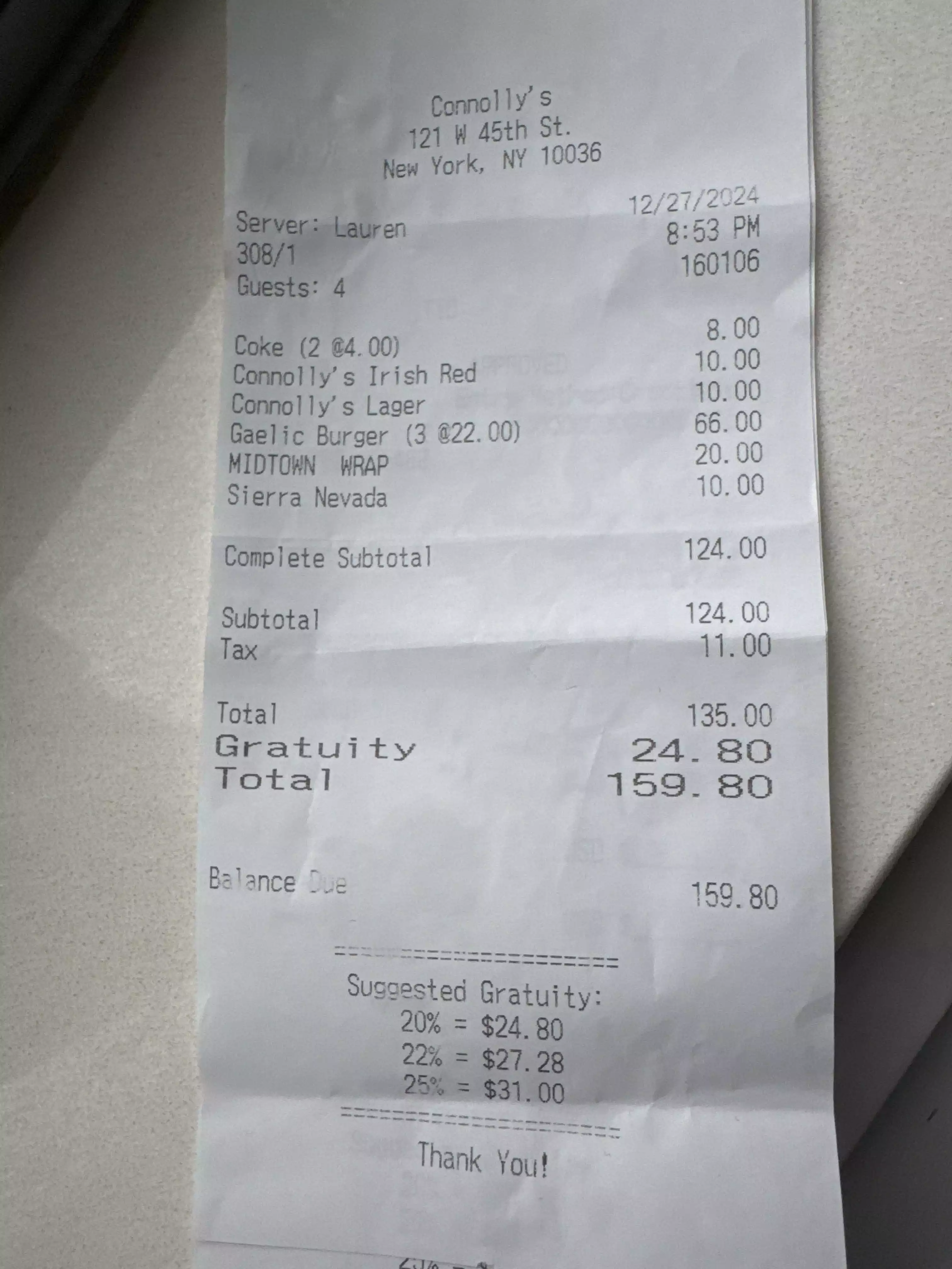 Our first impression of Connolly’s was great. The service was friendly and efficient, and the food was good and tasty. Portions were generous and the draught beer was good too ( the wine wasn’t great) but the evening took a downward turn when we got the bill. Although the service charge wasn’t added on automatically ( good) there was a 3% charge for using a credit charge. I assume this is just a New York thing as I’ve never experienced it elsewhere and it happened twice in 3 days in Manhattan. Why? Doesn’t everyone use cards these days?