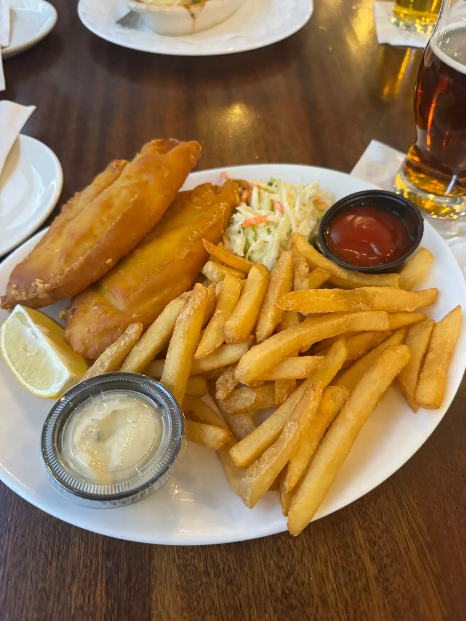Just wanted something quick and easy and fancied fish and chips. Seated quickly and got our drinks quick enough. Daughter ordered the chicken tenders which she was okay with, we had the fish and chips. Unfortunately really didn’t enjoy them. The fish batter was thick and the fish inside was soggy. Don’t know if the fish was old or what but it really was very mushy…. Sorry but failed big time