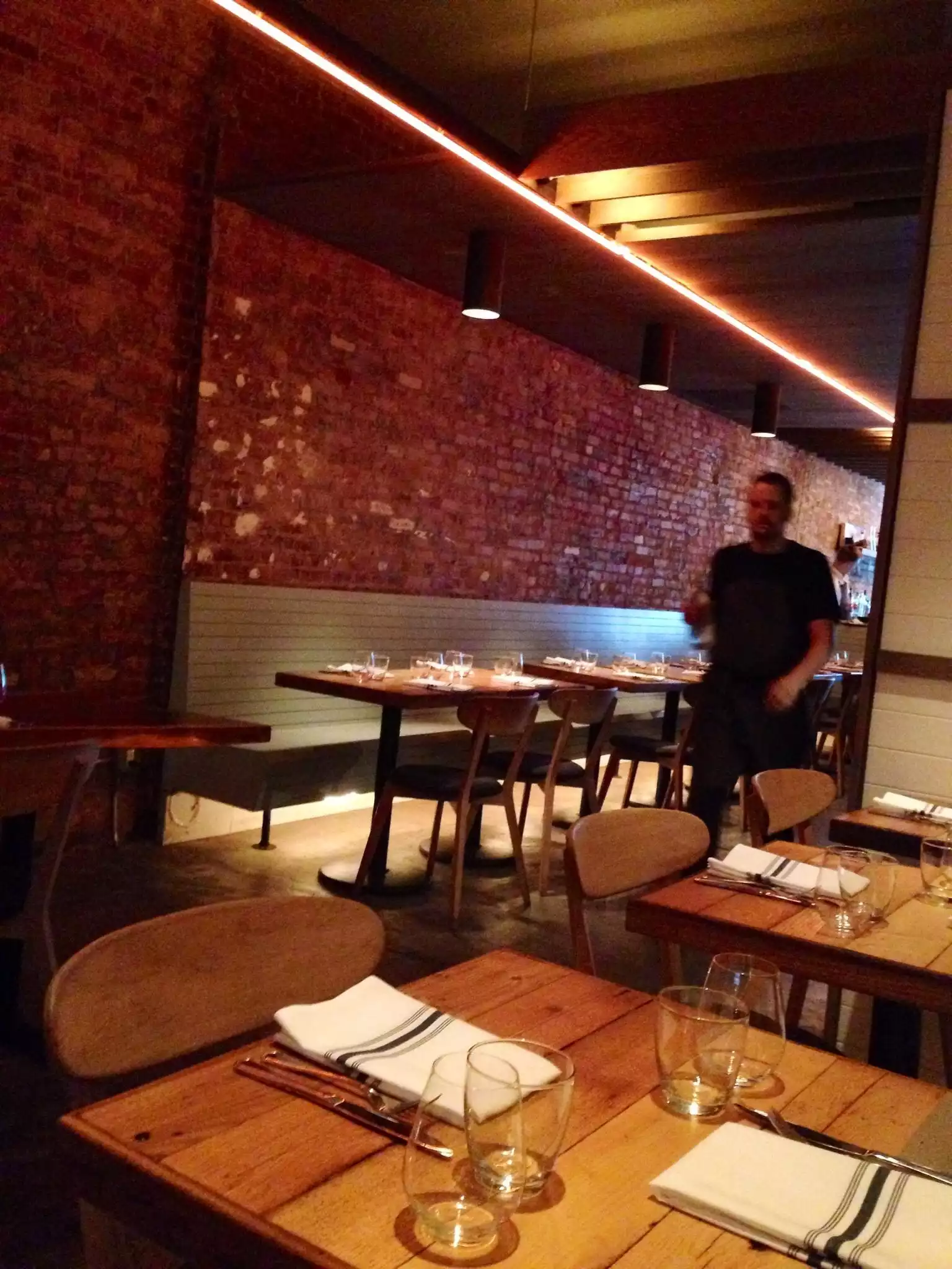 From outside looks like a casual bar. Dinning room is very Spartan but warm and clean. Staff are young hip but professional, competent and helpful. Neighborhood's very edgy and very NYC, not very touristy and very flash. Most customers were couples in their mid 20s to early 30s, people that appreciate Nomaesque food. Best parts were fantastic bread (worth extra 3 dollars), beef dish and deserts. The food is no choice 5 course at 55$, which is cheap. Wine list compact and nothing over 200 $. I wish we in OZ could do a hipster restaurant without the bull and attitude.