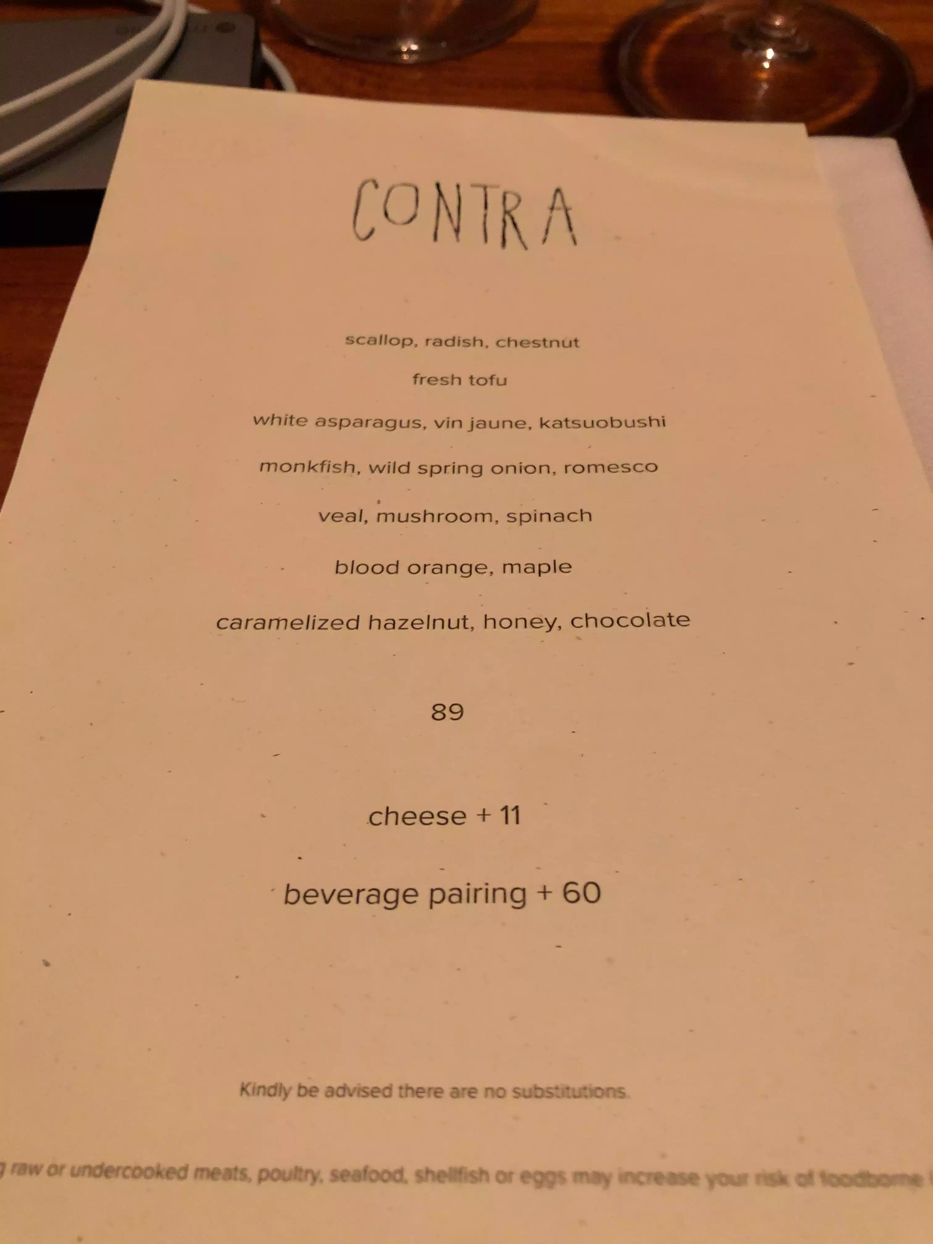 I had Contra at the top of my list of go to New York restaurants and was quite excited when I secured a reservation. It was a wonderful experience. A six course tasting menu full of creativity and wonder. And the desserts were just superb. Beautiful little restaurant with a great decor and vice. Excellent service.