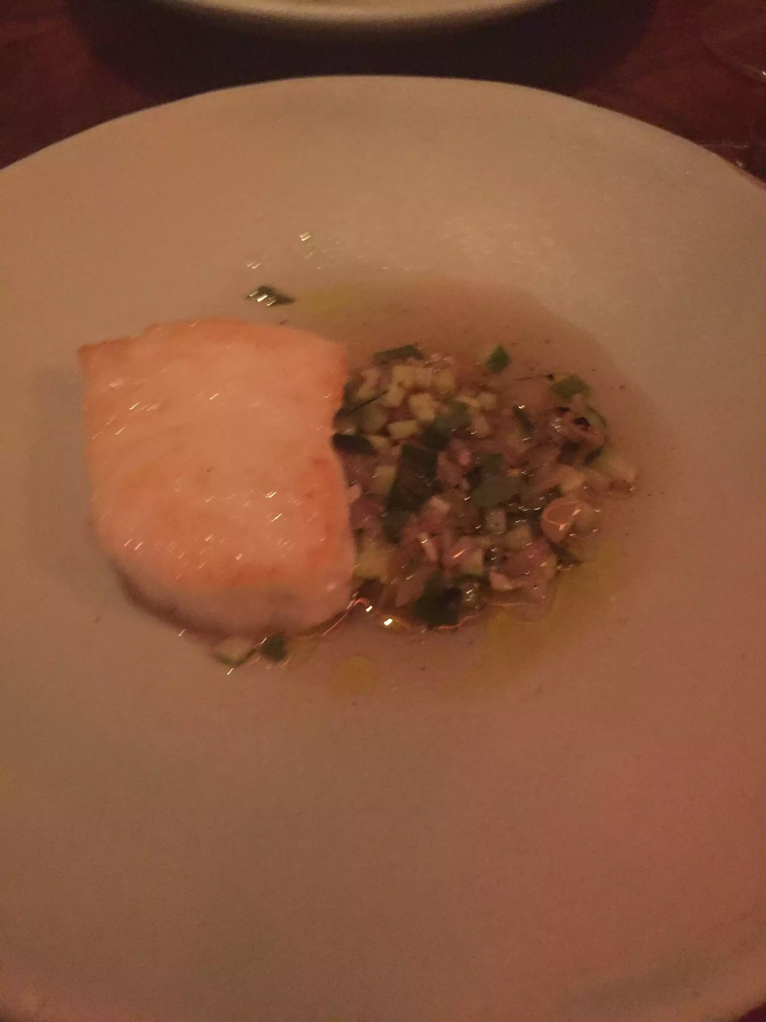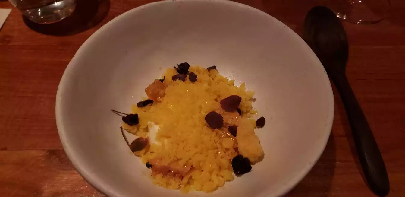 one 5 course menu to "chose" from and all the better for it. Once seated in this trendy & relaxed restaurant, you are presented with the menu, which, given its mandatory nature, serves only to hint at the wine pairing (which is optional). Thankfully, a sommelier was at hand and he offered to recommend his personal favorite which we happily took. Thus, we were able to place out foor & beverage order in record breaking time. All 5 dishes tasted great with just the right amount of creative twist and so did our orange wine from Sicily at a very reasonable 60 USD. However, I couldnt help noticing that it is the some menu I saw on a february review, which makes me wonder how often they change it. A set menu is a great idea but you need to make sure it keeps changing or you ll soon bore patrons.