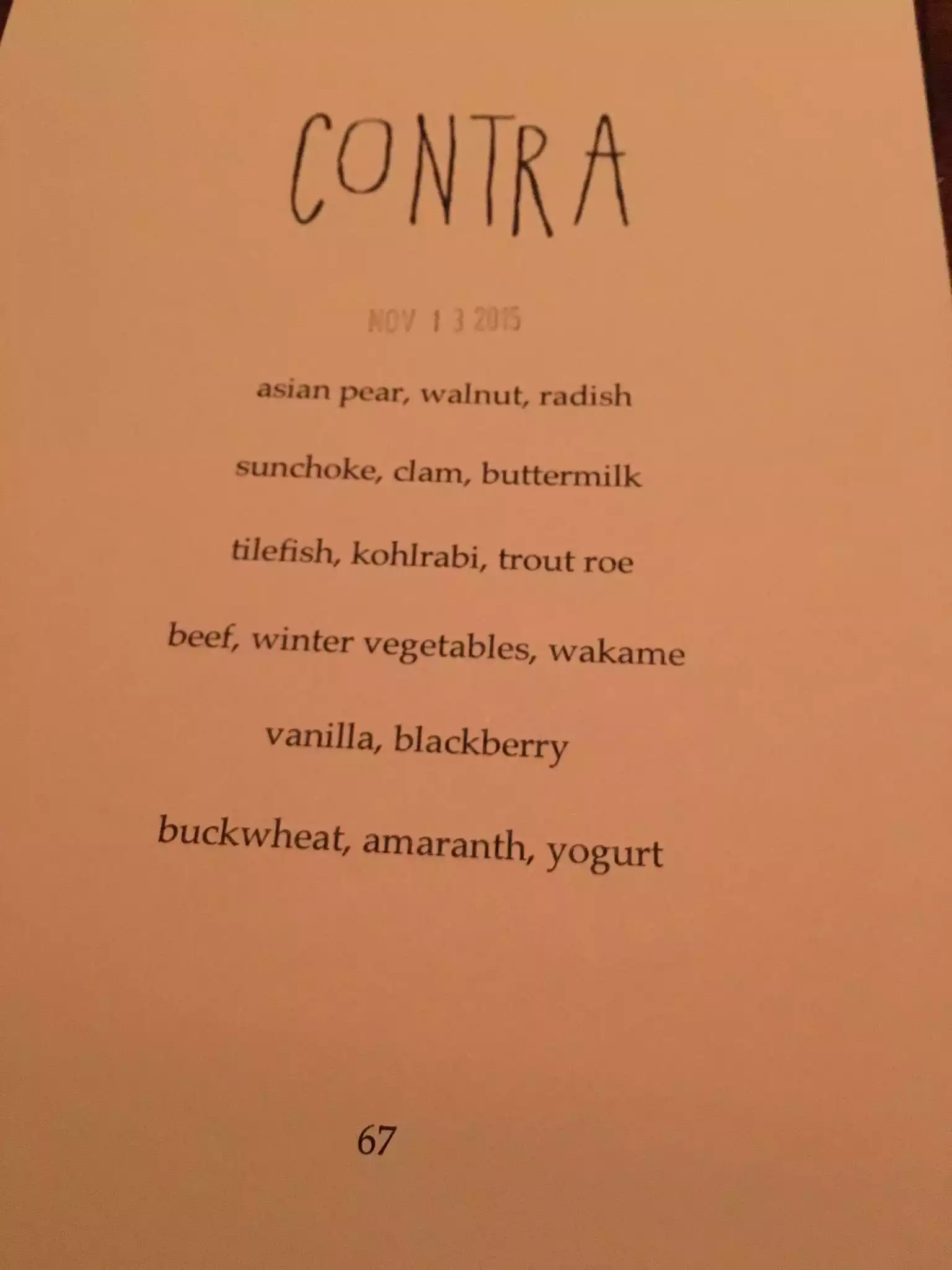 I've been wanting to try Contra for a while. Came once before but had to leave before being able to try anything. The price is reasonable and supposed to be a creative menu. I was generally underwhelmed. The bread was very good. Beyond that, nothing really stood out. All fine food just not impressive. Desserts were better than the savory dishes.