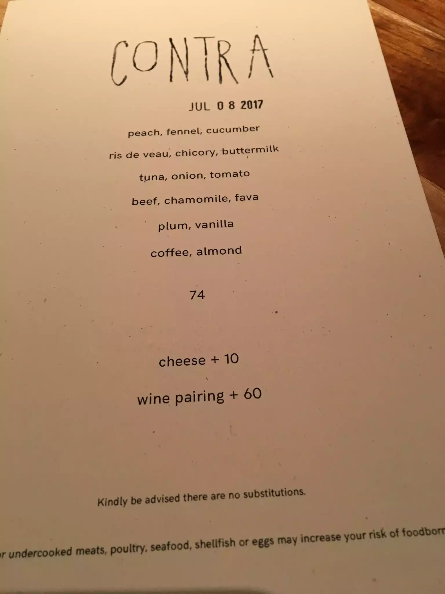 A friend took me and my son to Contra for dinner. My friend knows the staff very well so whilst we had the menu there were a couple of additional dishes thrown in for good measure. The food was exceptional the wine pairing out of this world. The thing I couldn't get over was the cost. Unbelievable value given the quality of the food and service. Can't wait to go back.