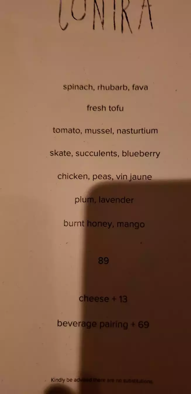 We had very vegetable and fish forward dishes, and all were delicious. The restaurant is very small and reminded us of Austin. We wish they had Austin air conditioning, as it was warm. Our menu was basically this (not chicken, though): lettuce & pistachio; summer squash, burrata (loved), sorrel; crab, english peas, potatoes (loved); fluke, almond, basil (loved); chicken, cabbage; cherry, charred milk (loved); peaches & corn (loved). Everything was amazing. Get the bread (separate charge)! We will be back. For a set menu, we thought $67/person was a good value.