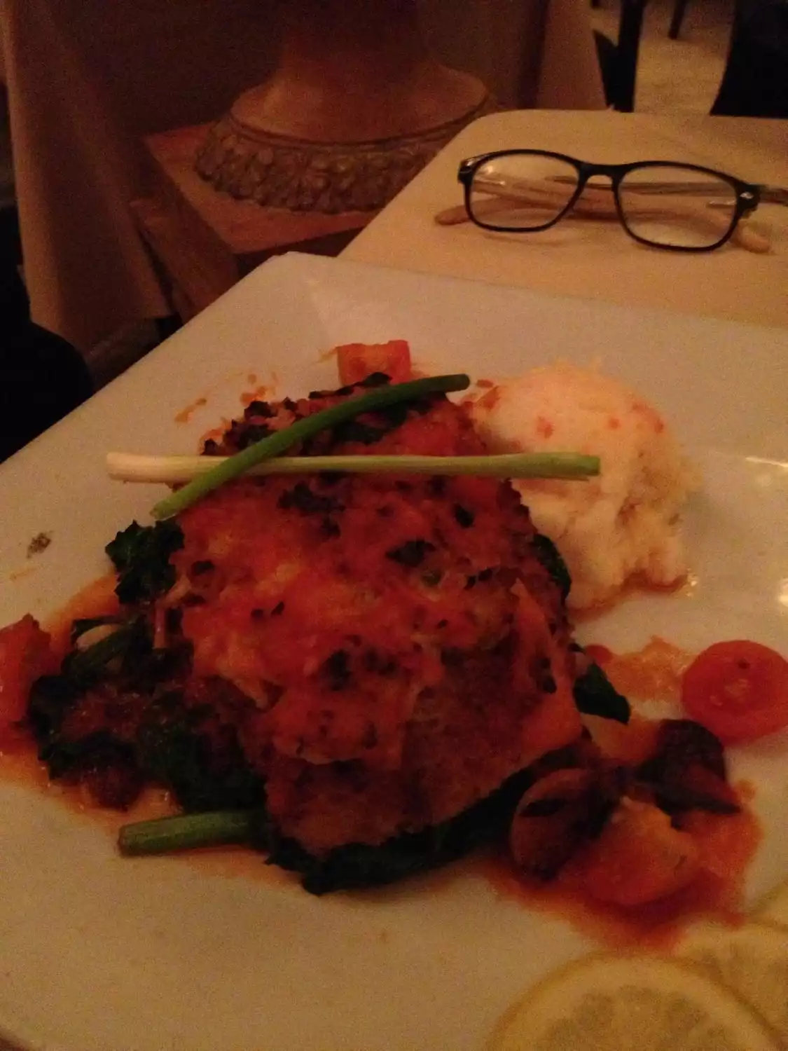 Negatives first, this is not the cheapest place in the area, service was great but slightly formal andalongside the music choice gave a slightly stuffy feel. There want huge choice for vegetarians, but as an ex-meat eater done of the Mains looked great and you can usually tell a good Italian when its brave enough to serve great meat/fish with well prepared veg. the only negative with the food was that they brought some warm bread abd olive oil, but rather than being fresh-warm it has been toasted and was thus a little dry, iwould have been happy with cold good quLity bread. The mrs had spinach ravioli which was pretty amazing to be honest. I had pasta and veggies in a tomato sauce, which was a subtle blend of flavours that really allowed the vegetables to come out from the sauce, with the button mushrooms giving a sort of beautiful woody undertone to the whole dish. Portion size was great, just right for full without being greedy. Dessert was amazing. Ricotta cheescake and pecan pie, big portions but a real treat.