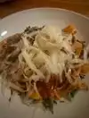 Although we had a reservation for 5, we were seated in a small booth in the back, directly under a very loud speaker, which made it difficult to carry on a conversation. The service was good and attentive. The baby lettuce salad ($11) had high marks. The Caesar salad ($14) was interesting with the red cabbage like substitute for romaine but delicious with the shaved Parmesan, anchovy’s and dates. The beet salad ($13) so just fair according to our friends. The Carbonara ($21) came beautifully presented with a perfect soft boiled egg on top. The pumpkin ravioli ($24) a bit greasy and the potato gnocchi ($24) blah without the promised addition of geoduck. With 8 glasses of wine, and the included 20% service charge, our bill for 5 came to $345.00 The bar was hopping and possibly a better place to dine than where we’d been seated.