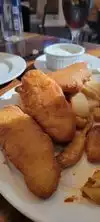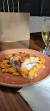 Disclaimer: I usually do not eat at hotel/cafe/restaraunts. I loved that our entire group had to show proof of being vaccinated before we were served. Our server immediately took our drink orders. Three of us chose the micro-brews. The server recommended a real hoppy one and it truly was so very tasty. Pints were $9 which according to my friends was a fair price. :) Three of us had the cheeseburger with bacon added. Super good as were the fries. The rest of the group had the shrimp scampi and raved about it. GRAND son enjoyed two orders of the B-que chicken wings and it was easy to tell he loved them. Service was beyond great, food was served hot and to my pleasure someone else picked up the tab. :)