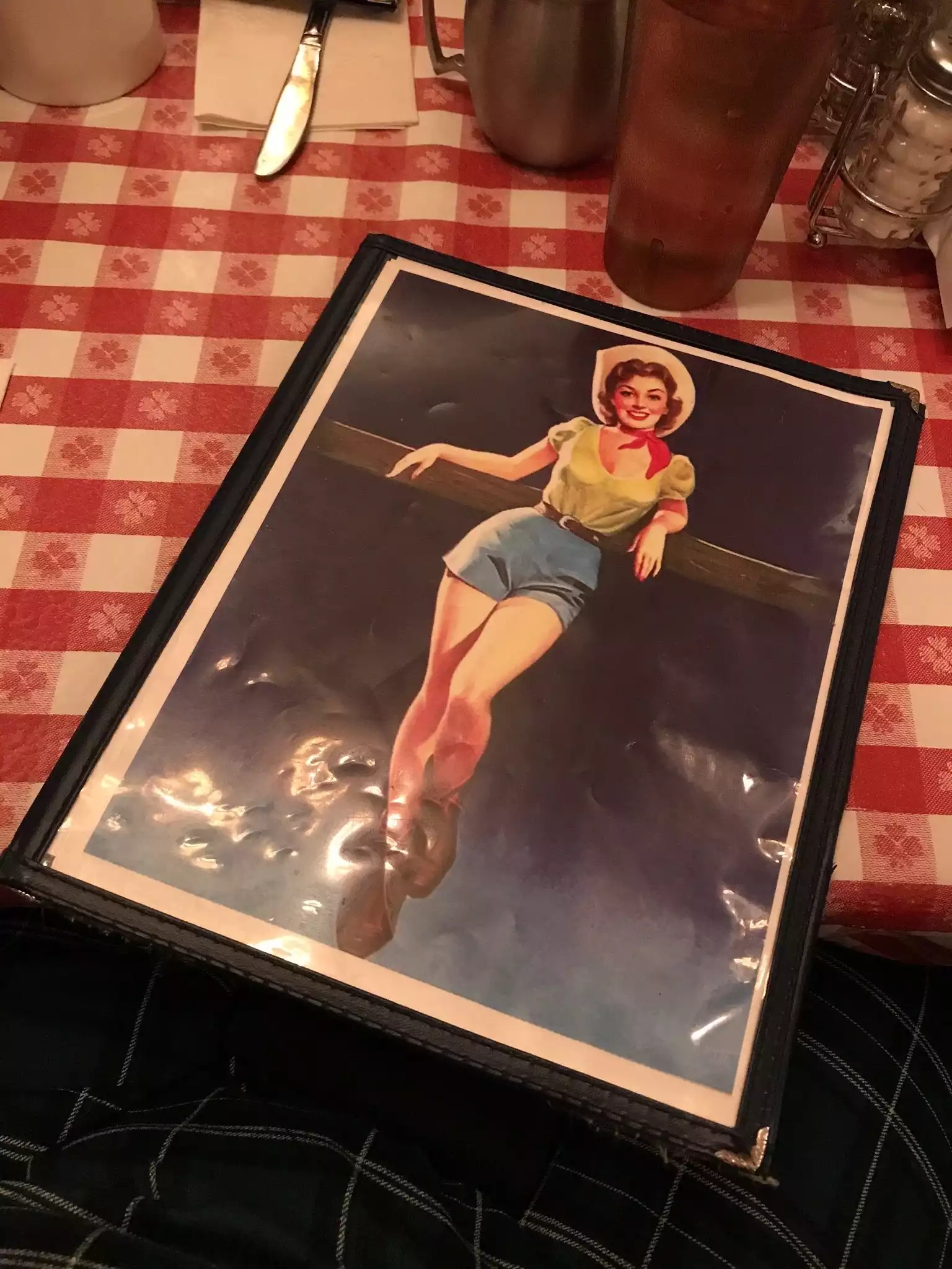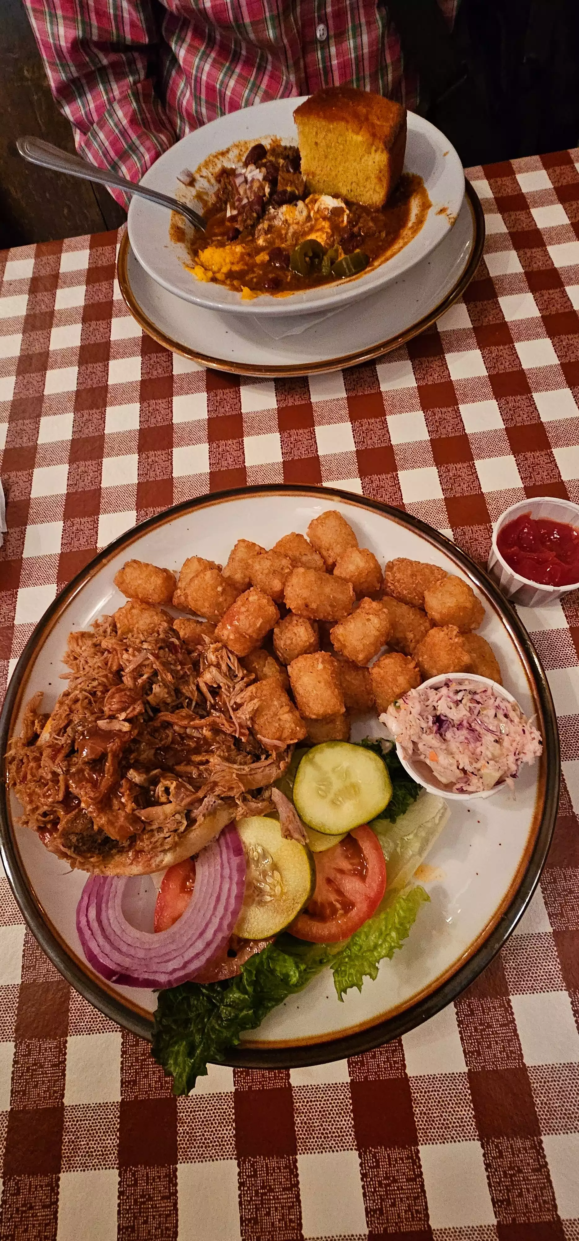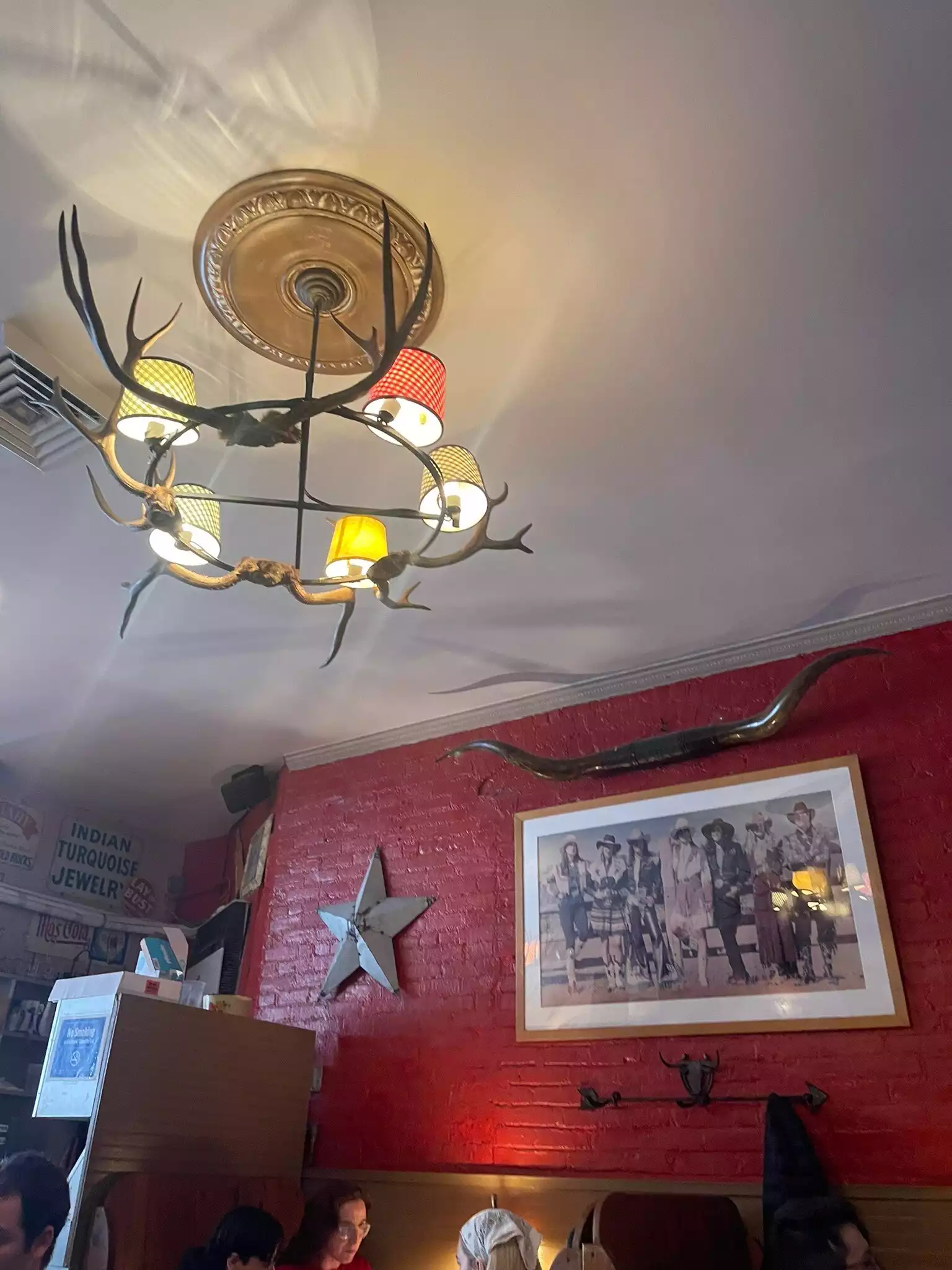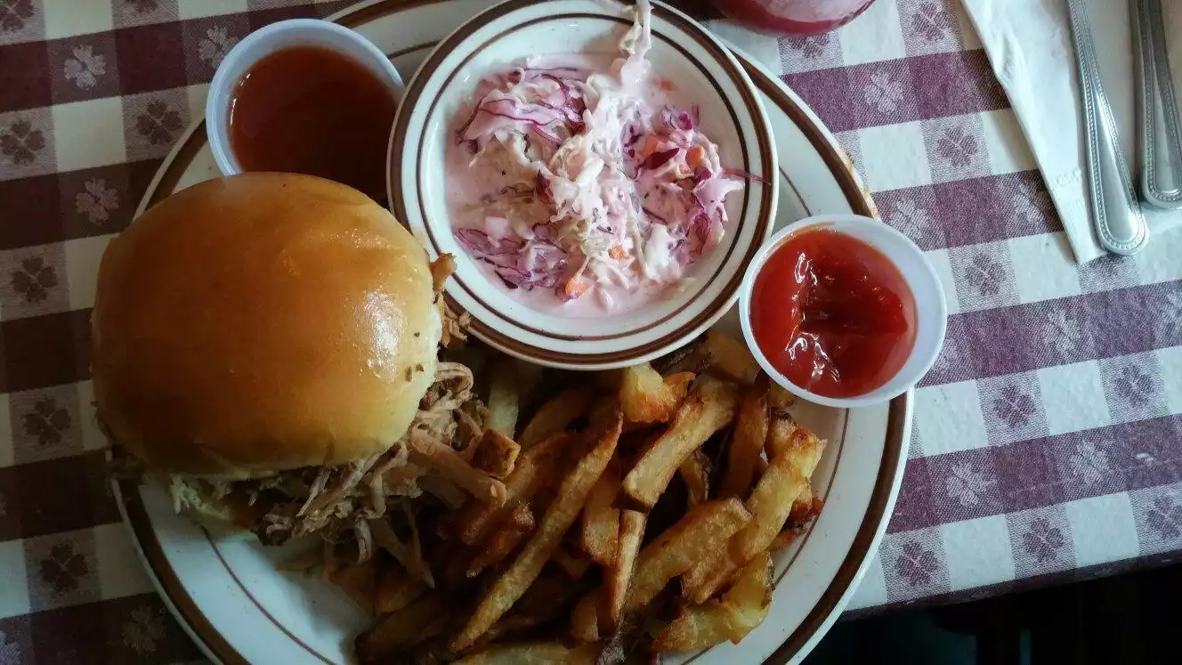We’ve been here a few times and it’s always a great experience. Worth a visit just for the old western lamps , horns, photos of cowgirl& horses, and furniture in back room! Don’t miss the walls on the way to the downstairs bathrooms. Now about the food. Reasonably priced , friendly waitstaff, good menu choices. We had vegetarian chili, and the macoroni and cheese with salad. Both were very tasty and good portions. The salad dressing was great- made in house ( I asked !) Took pecan pie home for later- excellent. Wonderul whippied cream sent along with it was a nice surprise.