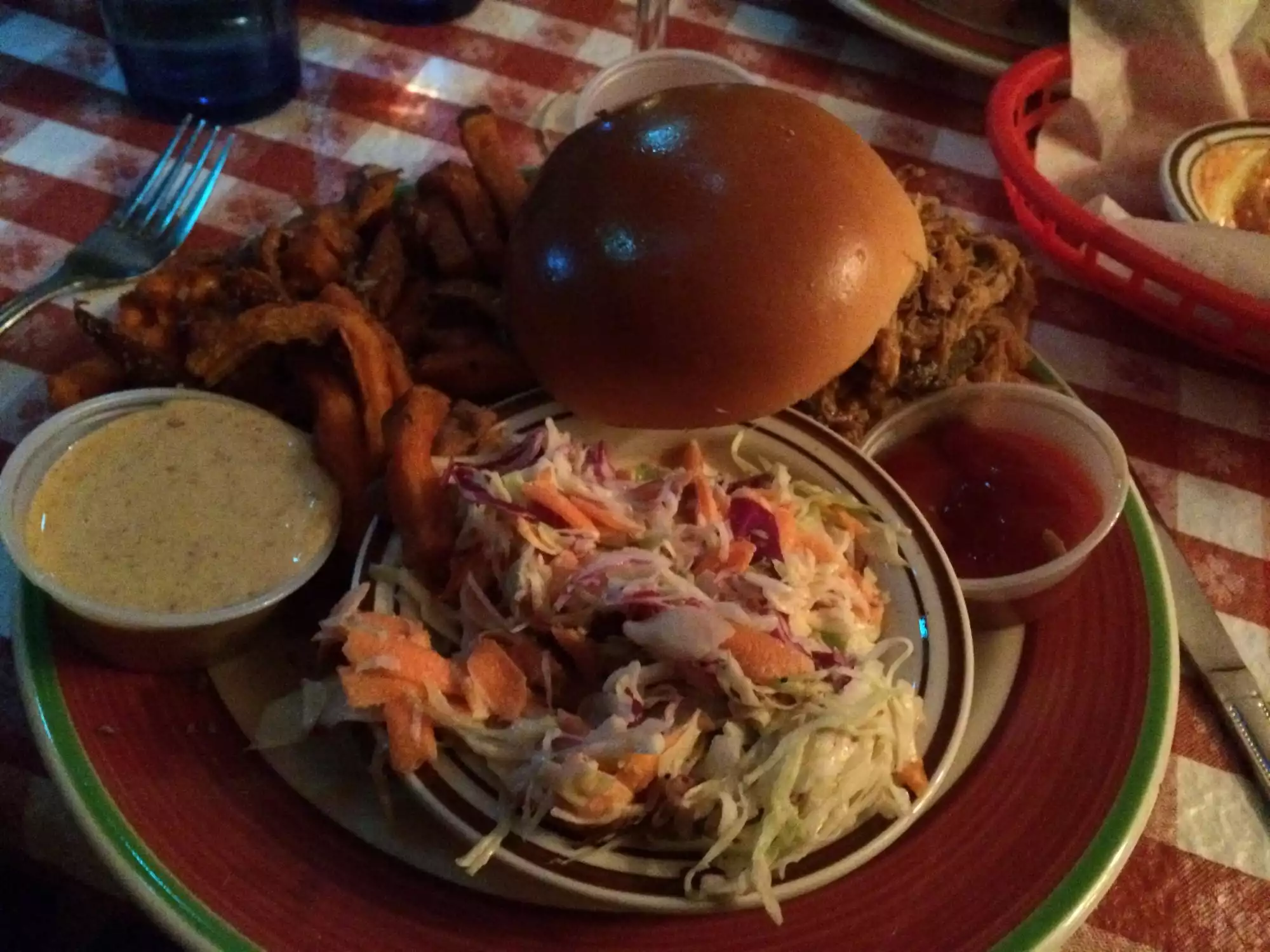 Busy place but excellent service. BBQ and great fried chicken. Appetizers are very good. Rattlesnake bites, bacon wrapped jalapeño peppers unique. Nachos well dressed. Ribs a bit disappointing, not fall off the bone! The baked potatoe ice cream dessert also unique and enough for at least 2. Cowgirl pilsner smooth. Very kid friendly and fun for them! Although arcade games were not working!