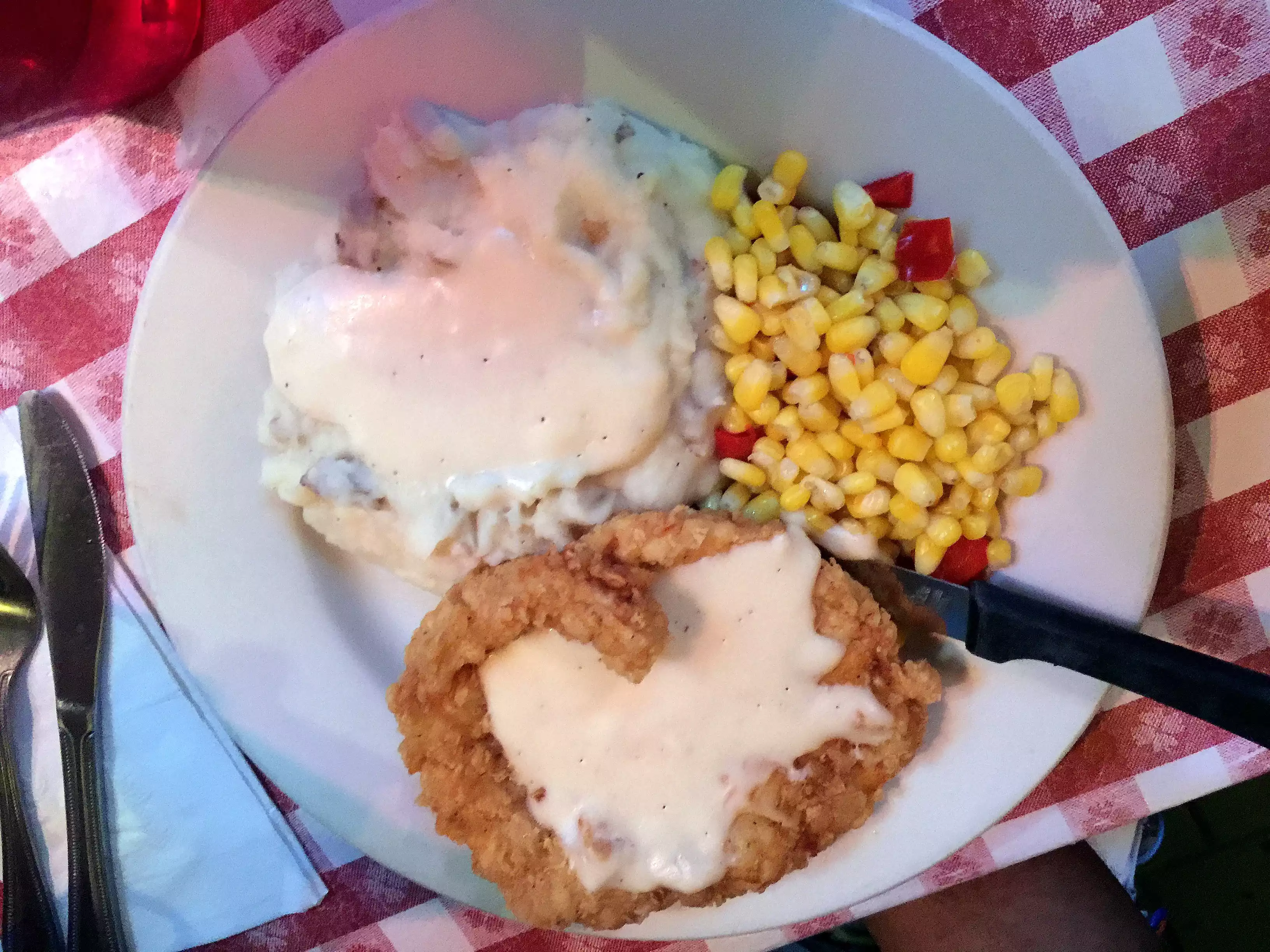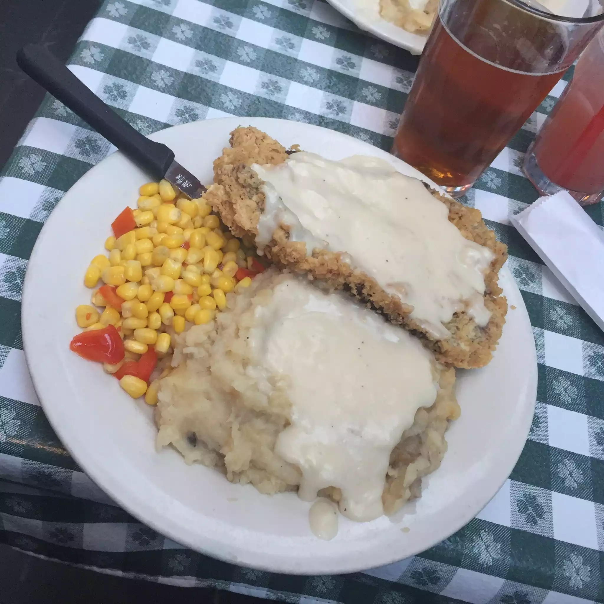 Visited with a friend as we wanted to sit outside and watch the free street entertainment (NYC on a Friday evening!). Very friendly service brought me chicken fried steak with mashed taties and corn with red pepper chunks. All cooked and served just-right, and tasted delicious. They had a large selection of drinks, a decent range of beers on tap inside at a lively bar.