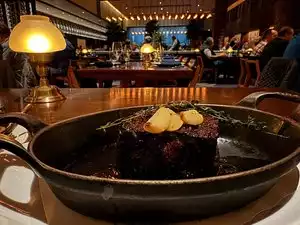 I have dined at the bar and the main dining room. The experience is different but this a great restaurant for a carnivore. I had the Italian mozzarella as a starter and the short ribs as the main. The short ribs were flavourful and tender. The presentation is in a copper sauce pan.