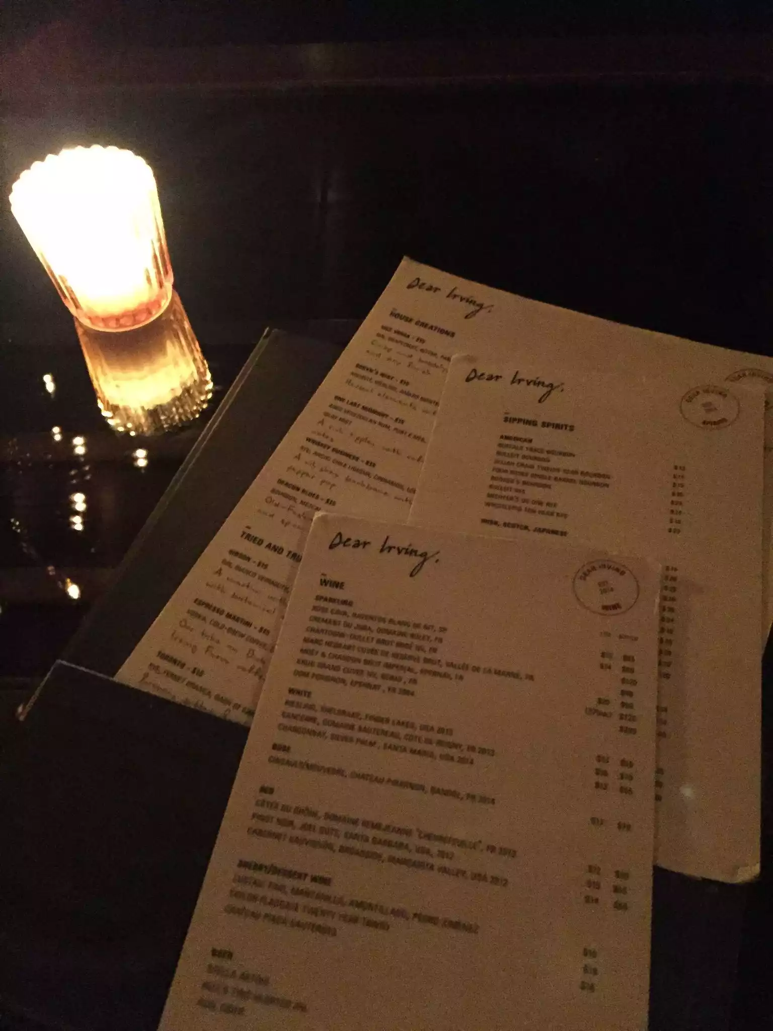 Such a fun place! Dear Irving is an elegant speakeasy. I went with my daughter and her friend for a drink after a Broadway matinee. We were seated in a back room with elegant, vintage decor. Sofas and tables. Great to relax and talk. The drinks are pricey, but definitely top shelf.