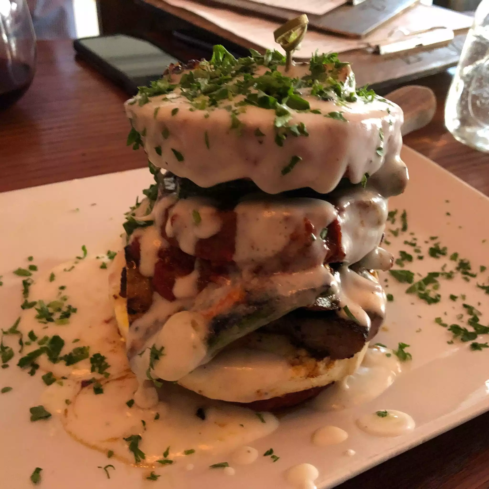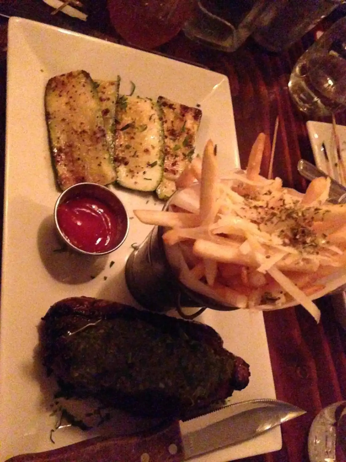 We were a group of eight, and sat in the comfy and semi-private “rustic chic” room adjoining the patio. Delicious stacked moussaka, layered with slices of zucchini and eggplant. Very light and tasty. The souvlaki “tacos” were difficult (i.e. messy) to eat — a whole grilled sausage was placed in an open pita and the goopy sauce kept leaking out. The oregano fries were yummy.