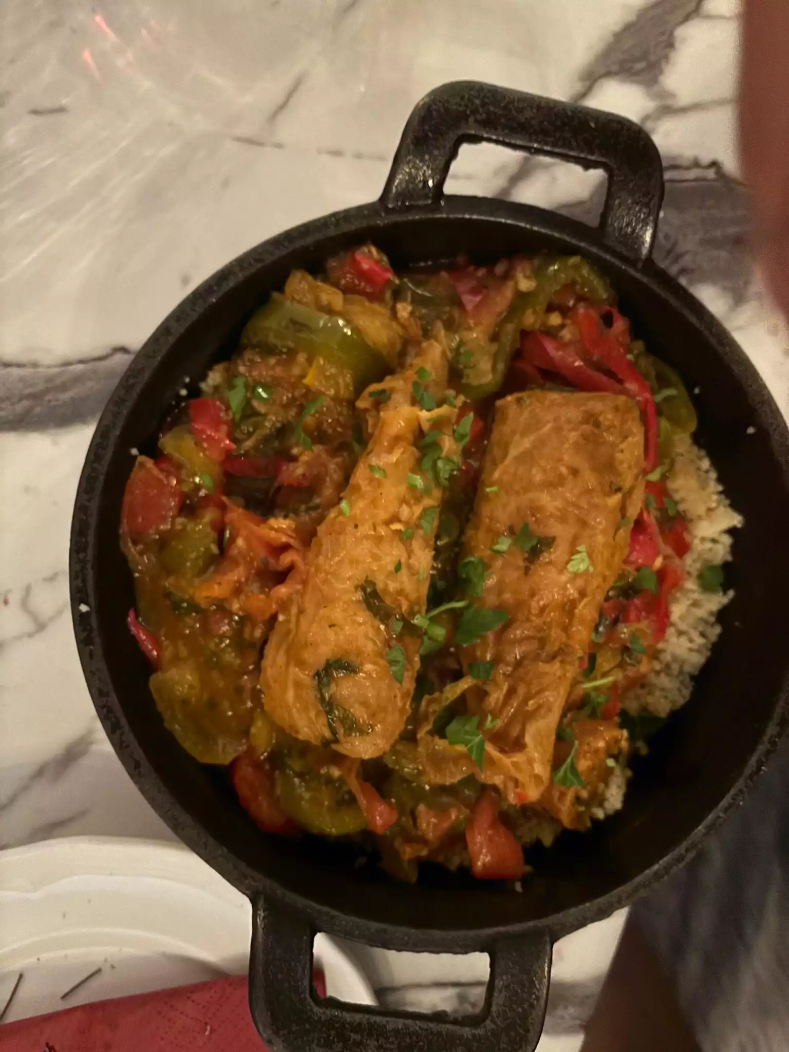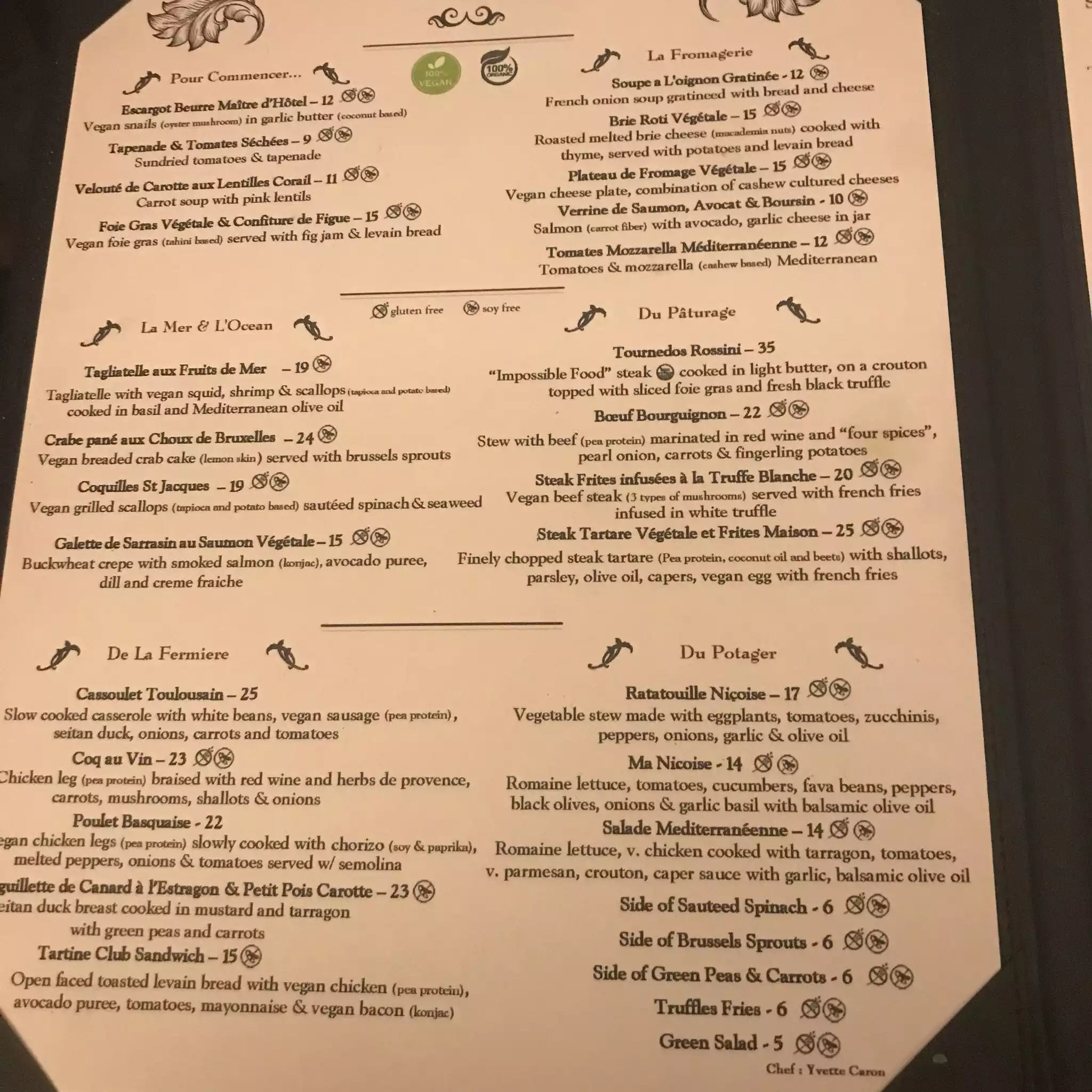 Not a vegan myself but amazingly surprised with flavors texture of dishes imitating traditional French dishes; cheese platter with scrumptious bread, crepe escargots or onion soup followed with beef bourguignon coq au vin or steak frites whatever you select you’ll enjoy And if if still room taste the dessert plus great service