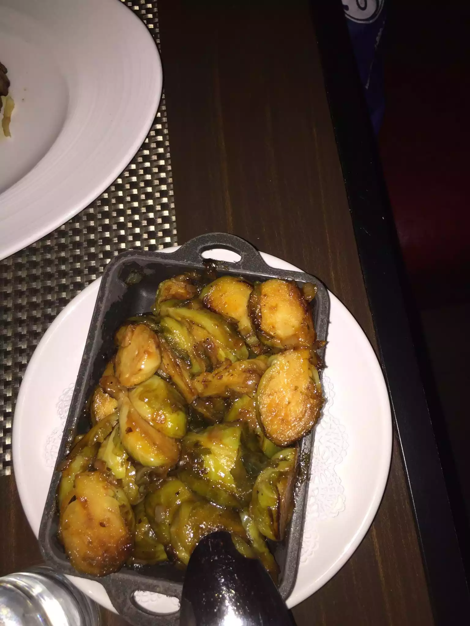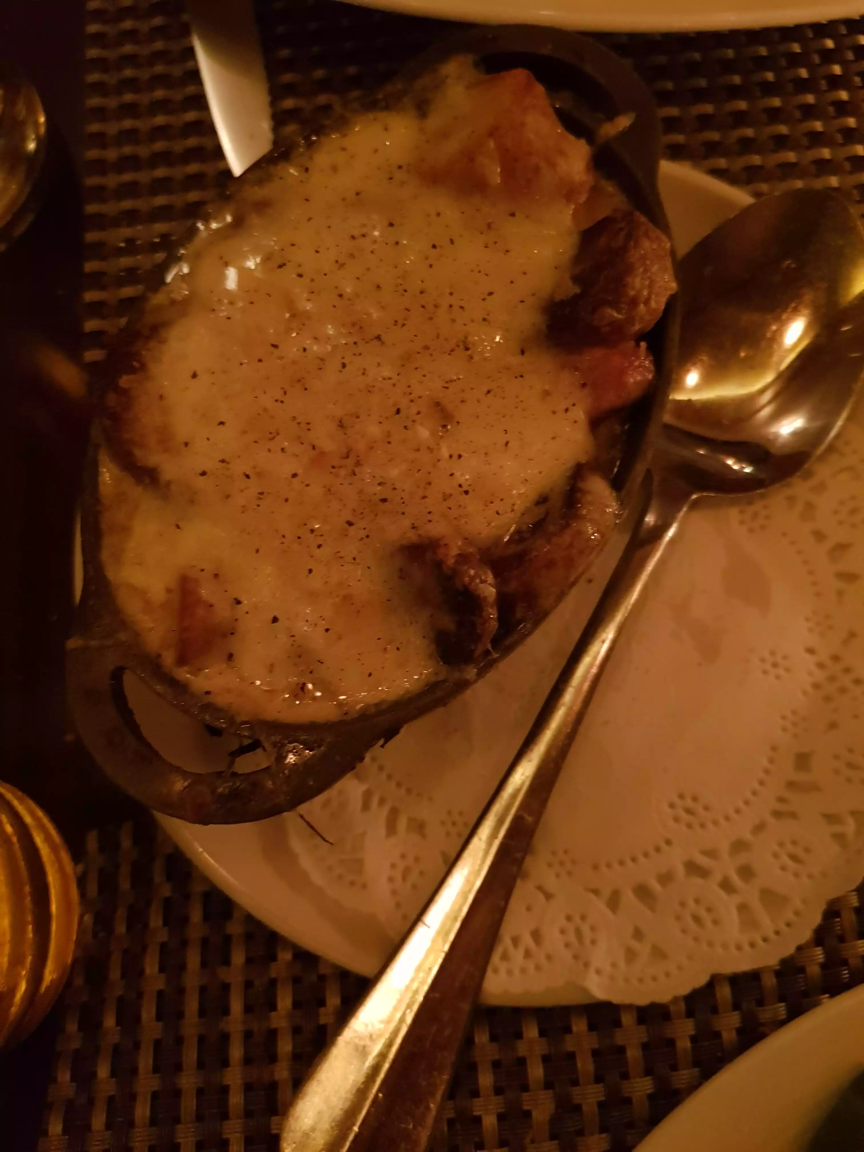 Our waiter 'inaugurated' us to their fine butcher's pick of tomahawk steak....for two: three lbs of prime rib with bone. It was a meal by itself as it came with roasted mini potatoes, mushrooms and onions.....order nothing else..as it was just right for the two of us with a baked clams appetizer! Amazing...juicy...cooked to perfection.....what an experience! ahhhhh....